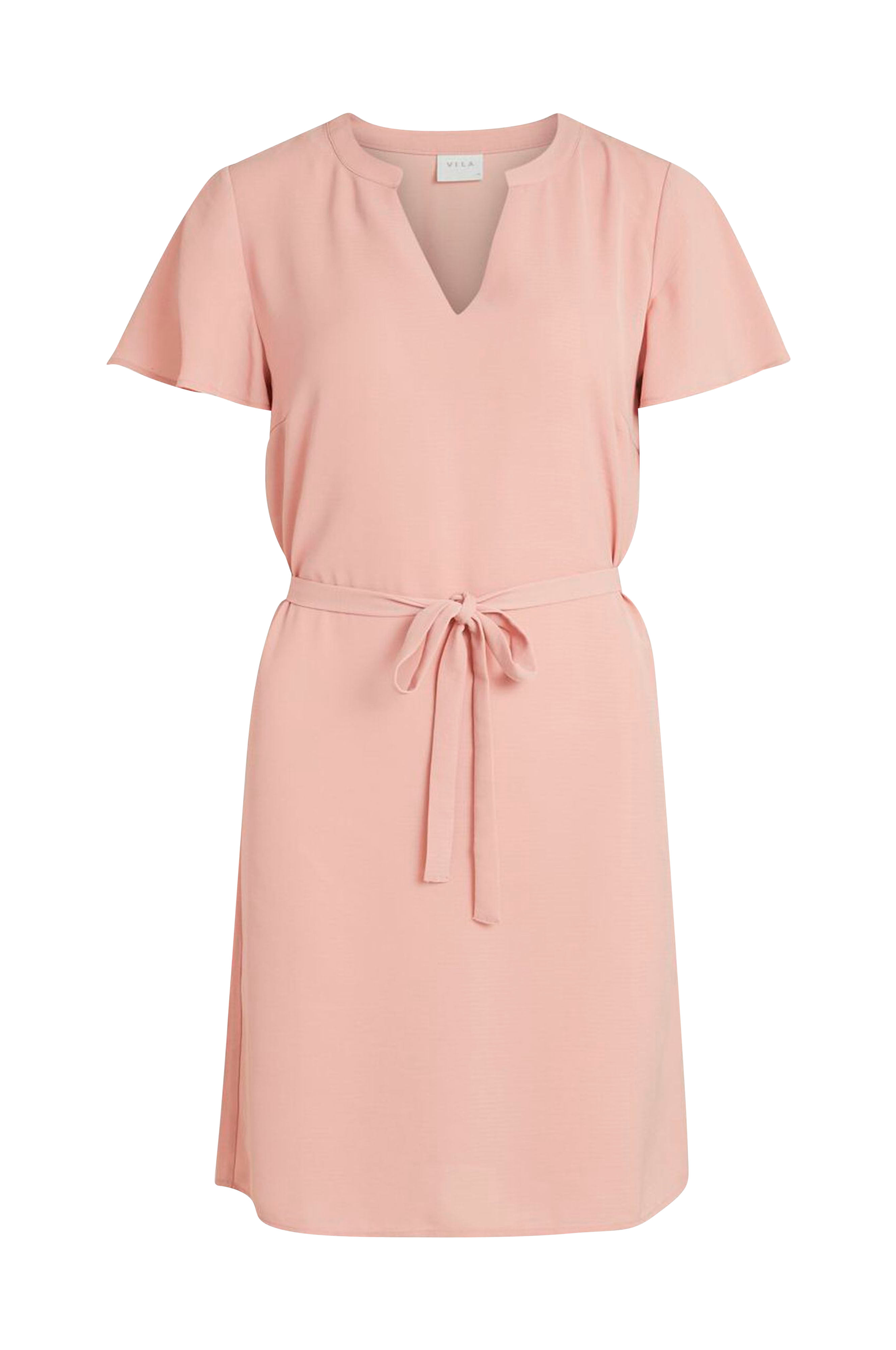 Mekko, jossa lyhyet perhoshihat ja V-pääntie edessä. Solmimisvyö vyötäröllä. Kangasta. Pituus n. 90 cm koossa 36.