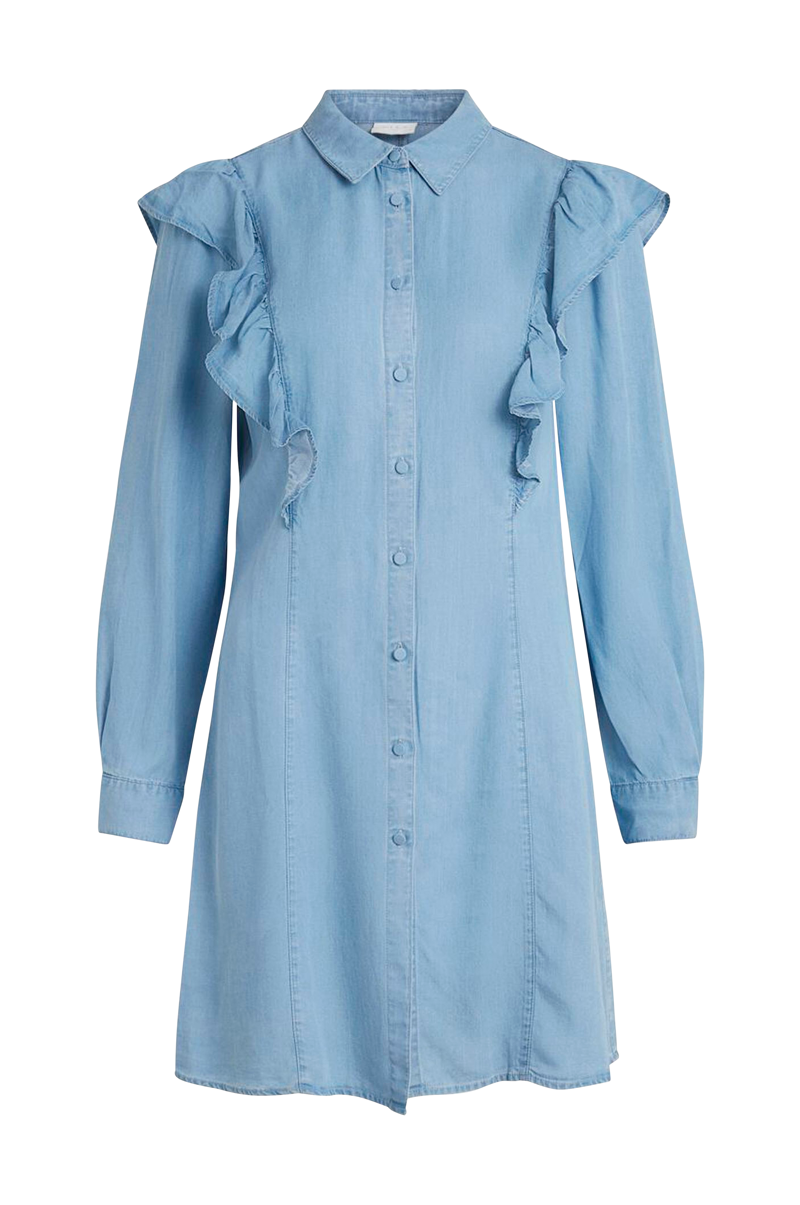 Hieman vartalonmyötäinen mekko ohutta ja myötäilevää denimiä. Pitkittäissaumat edessä ja takana ja röyhelöt olkapäillä. Pieni kaulus ja edessä päällystetyt napit koko pituudelta. Erittäin pitkät hihat, hihansuissa kalvosin. Pituus n. 90 cm koossa 36.