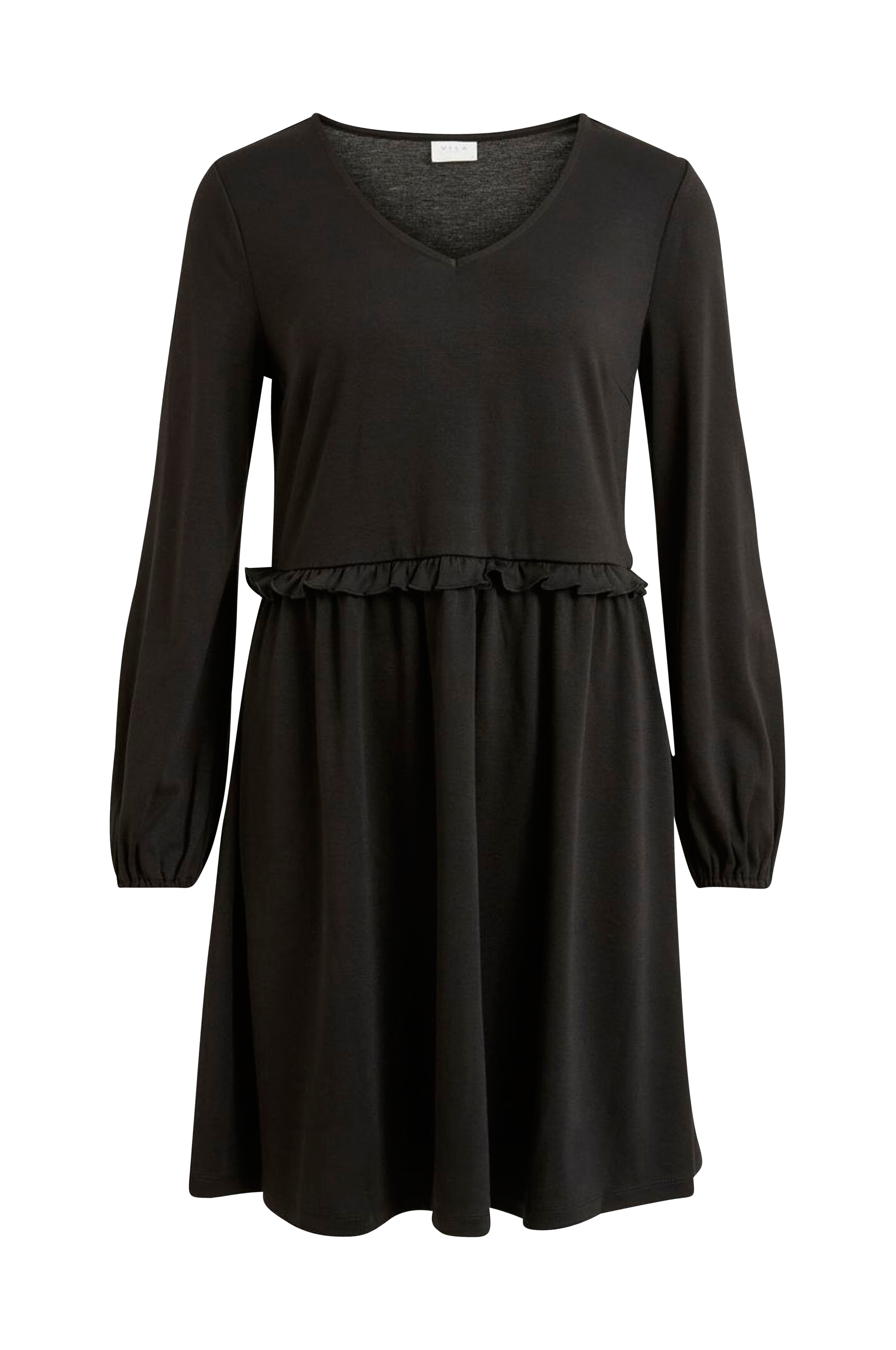 Vila viTinny V-neck Doll Detail Dress -mekko. Levenevä malli trikoota. Poikkileikkaus ja pieni röyhelöreuna vyötäröllä sekä leveä hameosa. Kevyt V-pääntie, jossa kapea päärme. Pitkät, suorat hihat, joissa upotettu kuminauha hihansuissa. Pituus n. 91 cm koossa S.