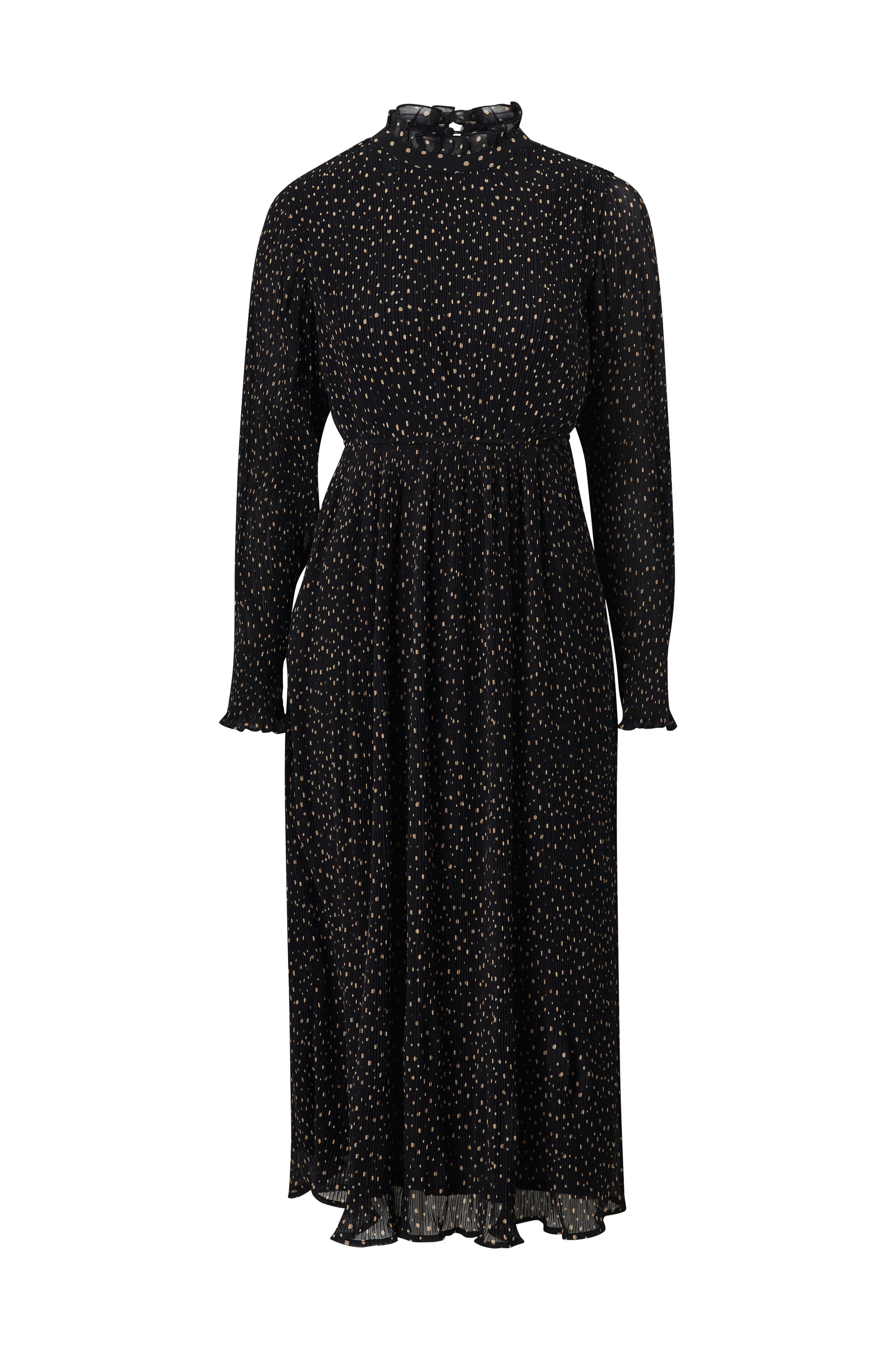 • Laskostettu mekko • Joustava vyötärö • Korkea kaula-aukko röyhelöllä • Halkio napeilla niskan kohdalla • Pitkät hihat • Trikoovuori • Pituus: 123 cm koossa 36 • Tuote sisältää kierrätettyä materiaalia, jonka käyttö vähentää jätteen määrää ja säästää luonnonvaroja.