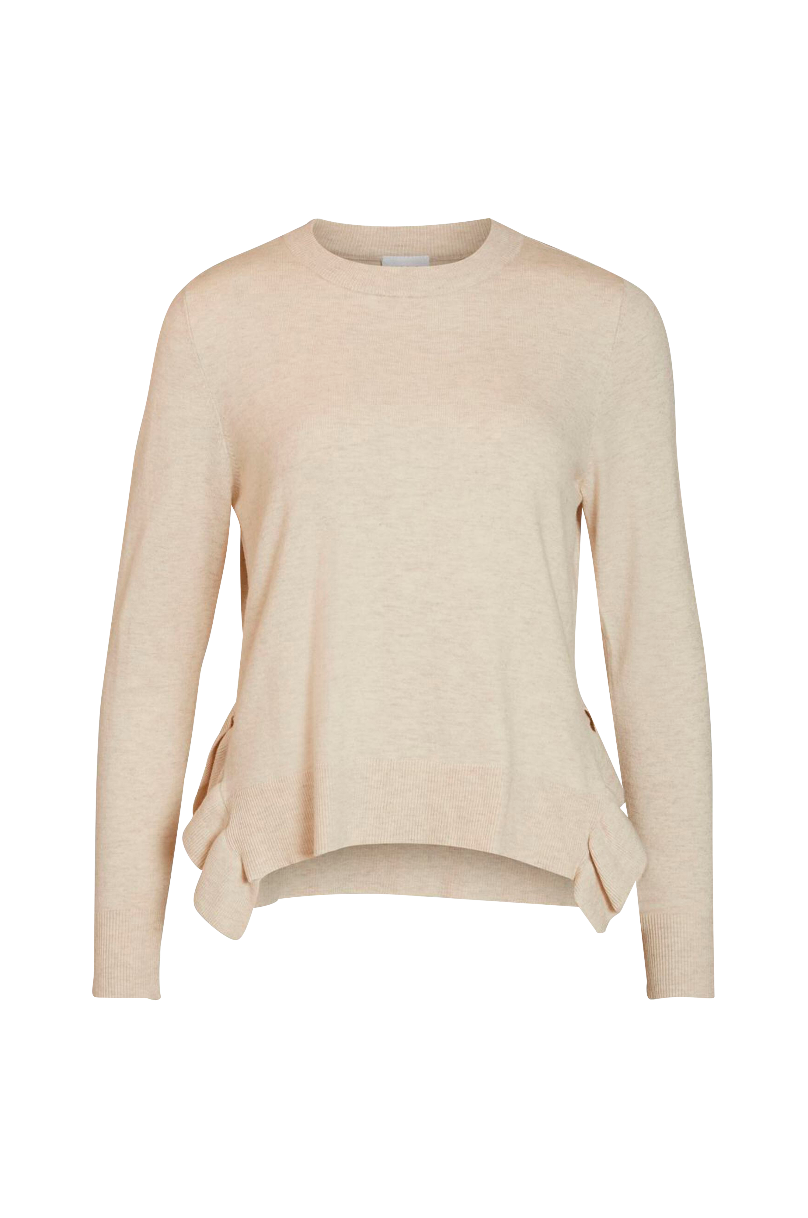 Vila viElasta L/S Knit Top -neulepusero pehmeää ohutta neuletta. Röyhelökoristeiset sivuhalkiot. Joustinneulereuna helmassa, hihansuissa ja pääntiessä. Neulepusero on takaa hieman pidempi.