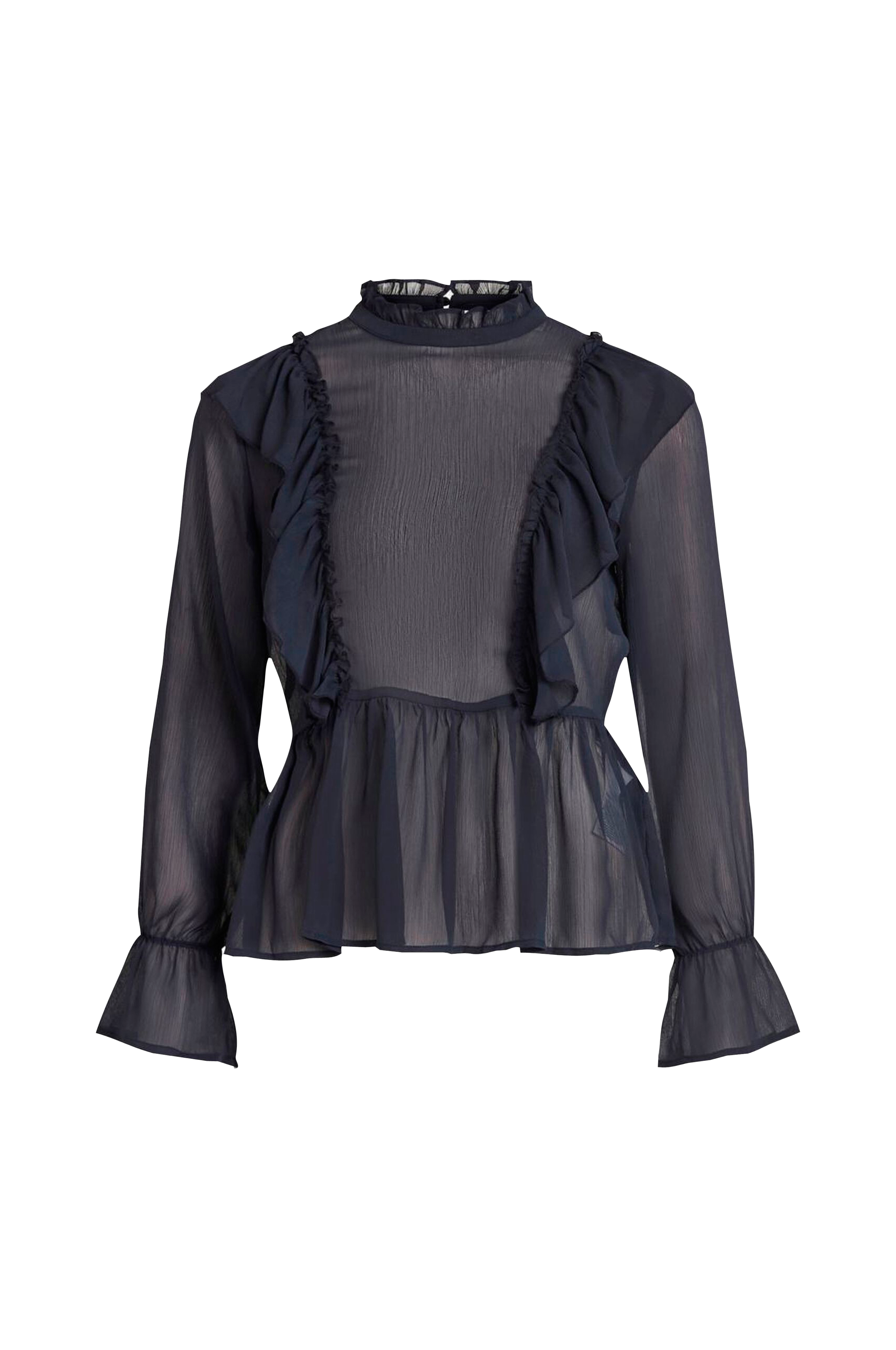 Hieman vartalonmyötäinen malli kreppisifonkia. Poikkileikkaus vyötäröllä ja leveä hameosa. Päälleommellut röyhelöt edessä, takana ja olkapäillä. Pyöreä pääntie, jossa pieni röyhelöreuna sekä halkio ja nappi niskassa. Pitkät hihat, joissa kuminauhasauma alhaalla.
