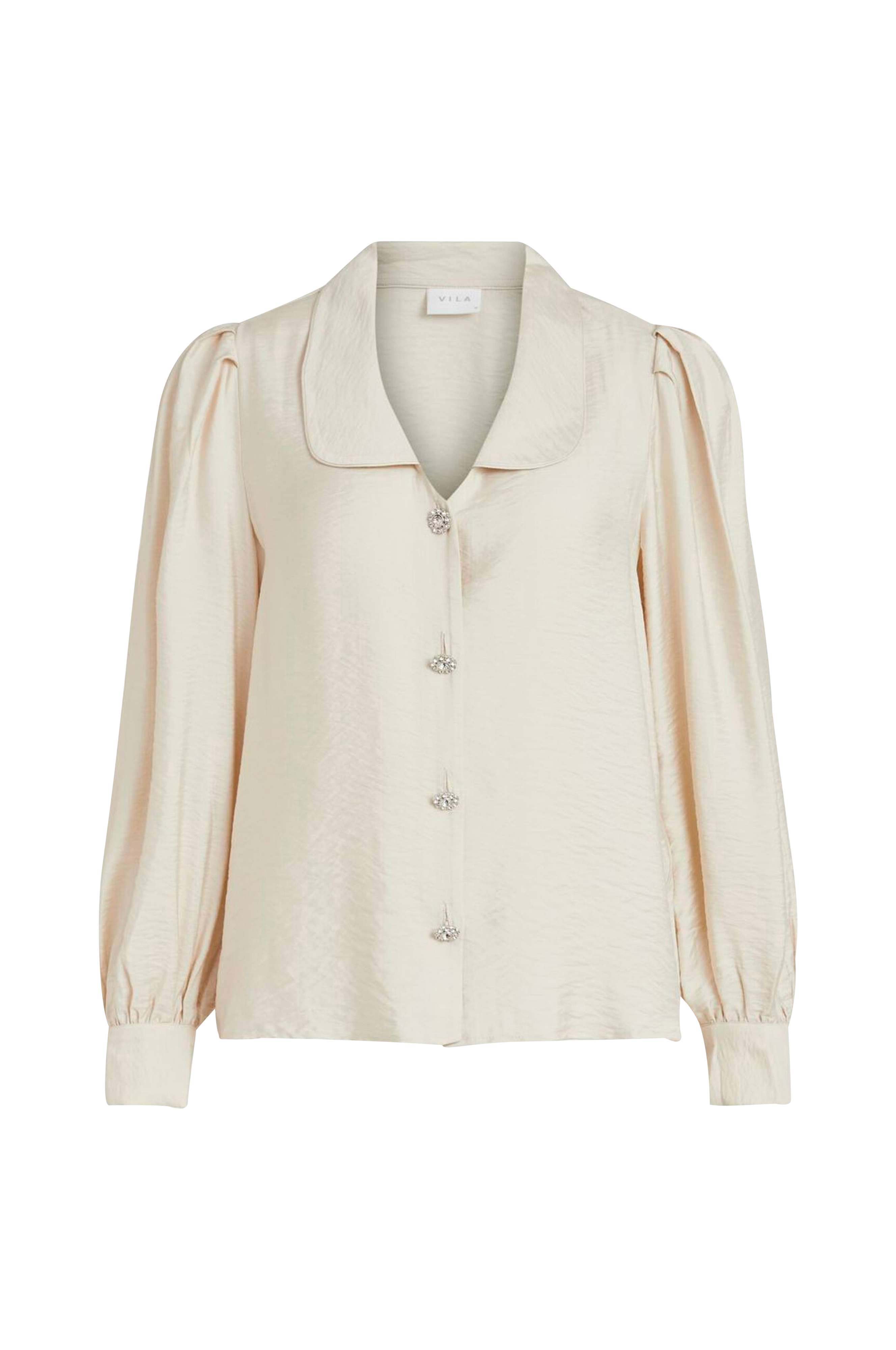 Kimmeltävät strassinapit edessä ja leveä, pyöristetty kaulus. Leveät pussihihat, joissa kalvosin ja strassinapit. Pintakuvioista viskoosisekoitetta.