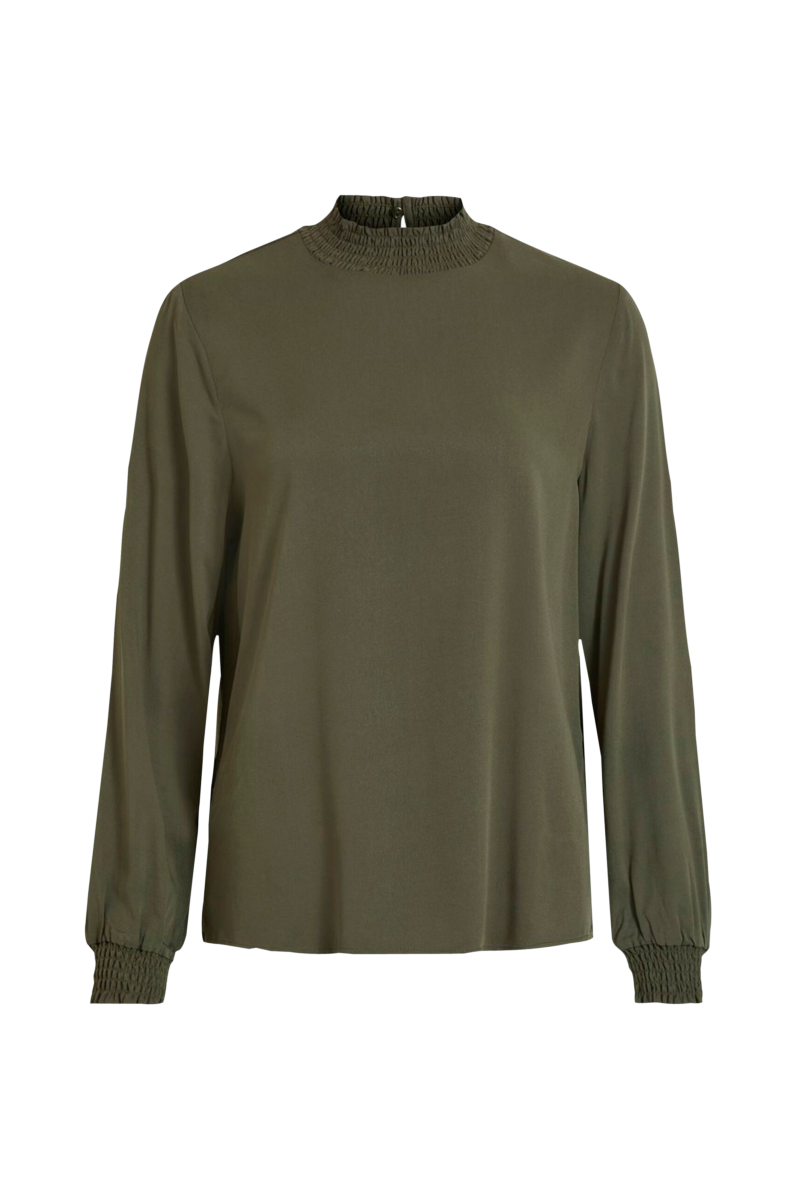 Vila viDania Smock L/S Top -paita. Suora malli ja korkea smokkirypytetty kaulus, jossa niskassa halkio ja sisäpuolella napit. Suorat hihat, hihansuissa smokkirypytys.