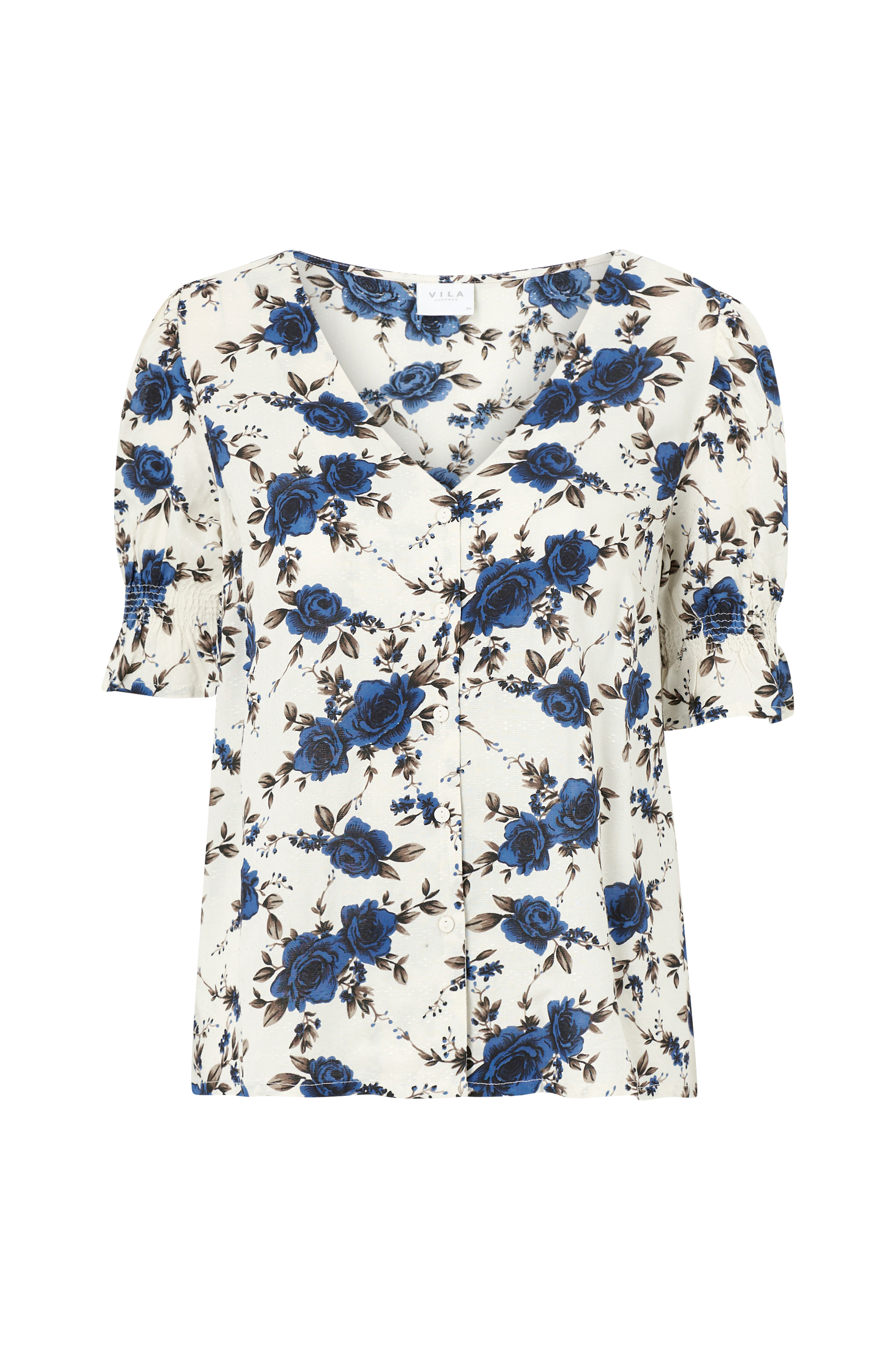 Kukallinen paita, jossa V-pääntie ja napit edessä. Lyhyissä puhvihihoissa smokkirypytys ja röyhelö hihansuissa. Hieman struktuuripintaista kangasta.