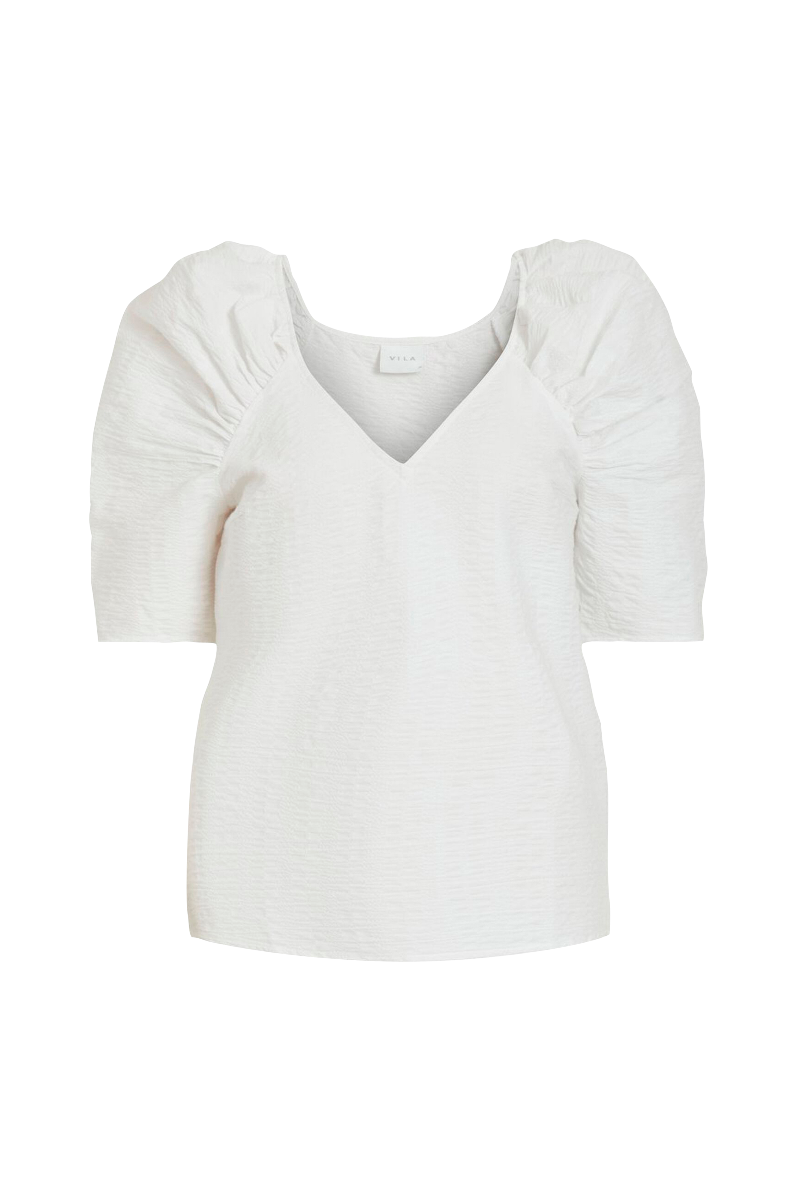 Vila viSota 2/4 Top -paita, jossa puolipitkät muhkeat puhvihihat ja v-pääntie edessä. Struktuuripintaista materiaalia.