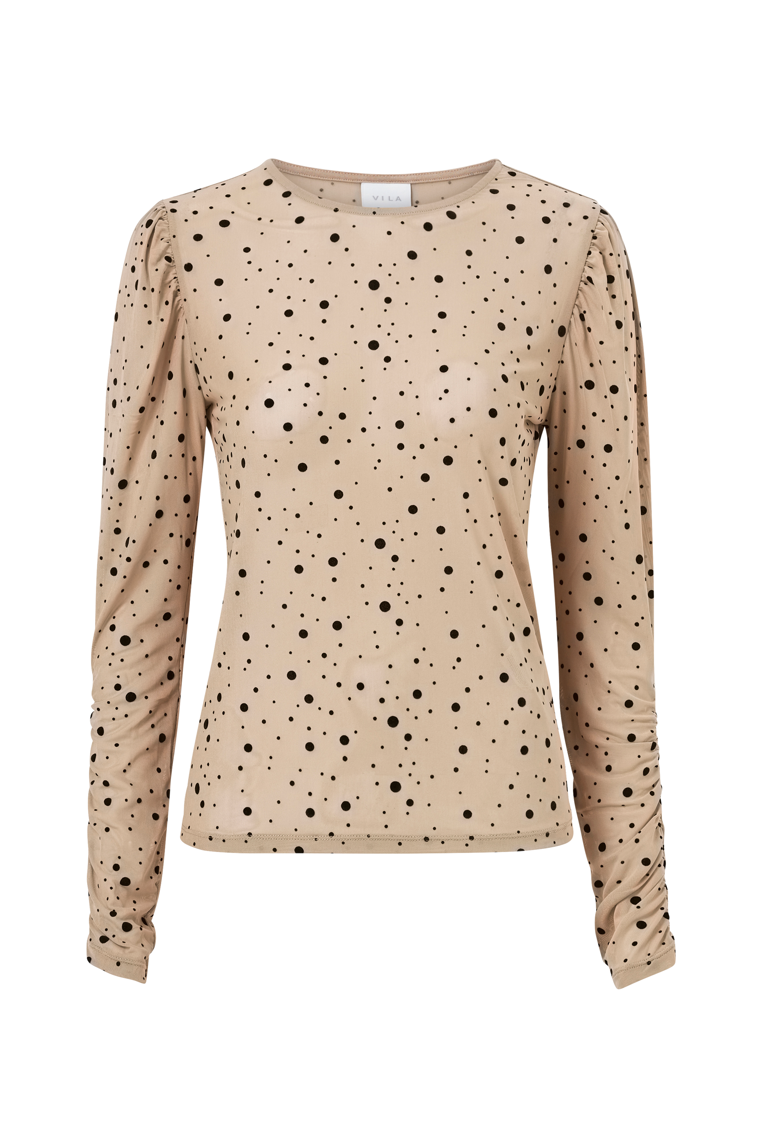 Ohut, hieman läpikuultava pusero verkkotrikoota, jossa sametinpehmeitä pilkkuja. Pitkät puhvihihat, joissa poimutetut hihansuut. Pyöreä pääntie.