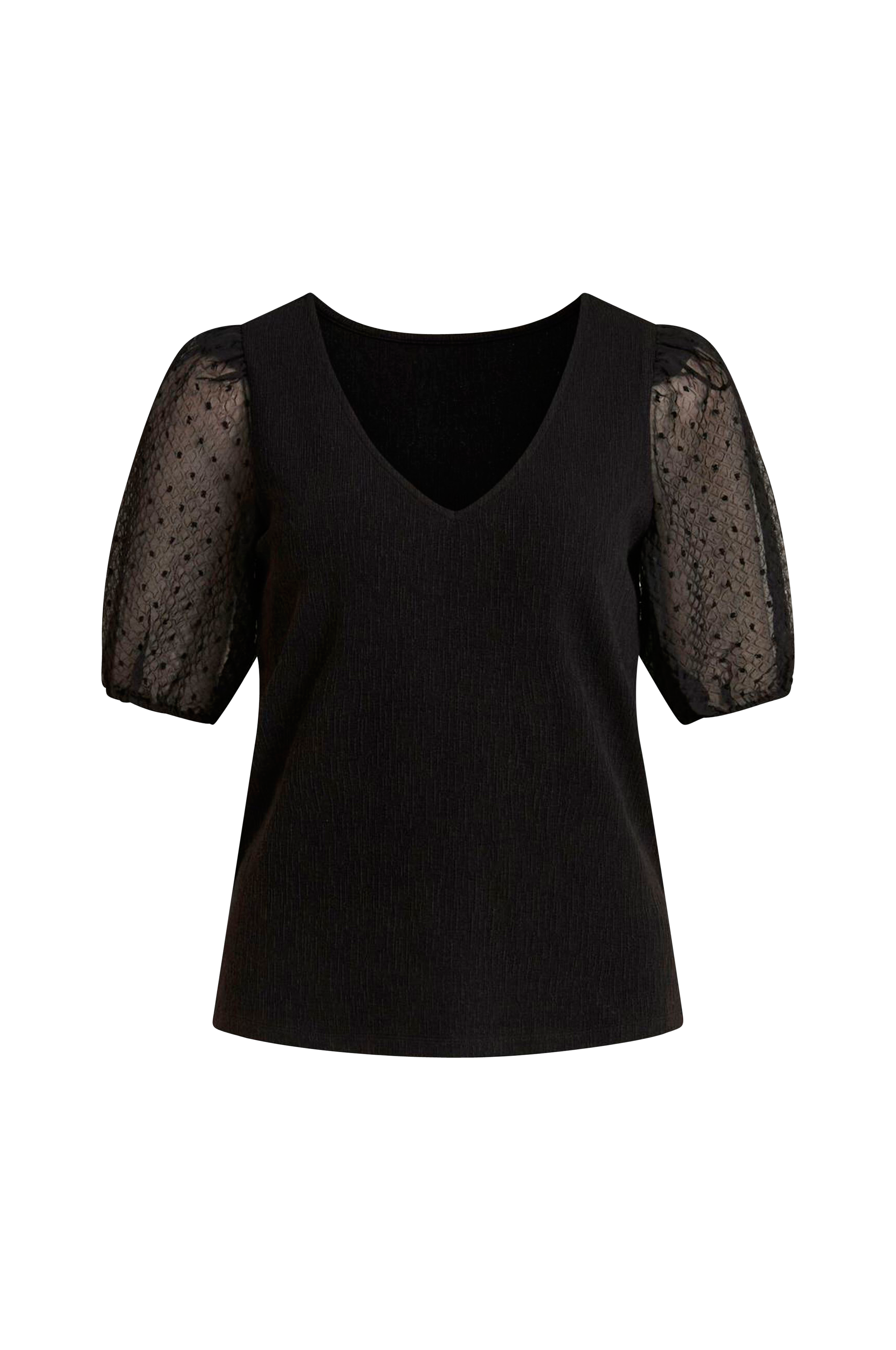 Pusero eläväpintaista jerseytä. Sifongista valmistetut puolipitkät puhvihihat, joissa poimutus olkapäillä ja upotettu kuminauha hihansuissa. V-pääntie, jota voi käyttää pääntienä myös selässä.