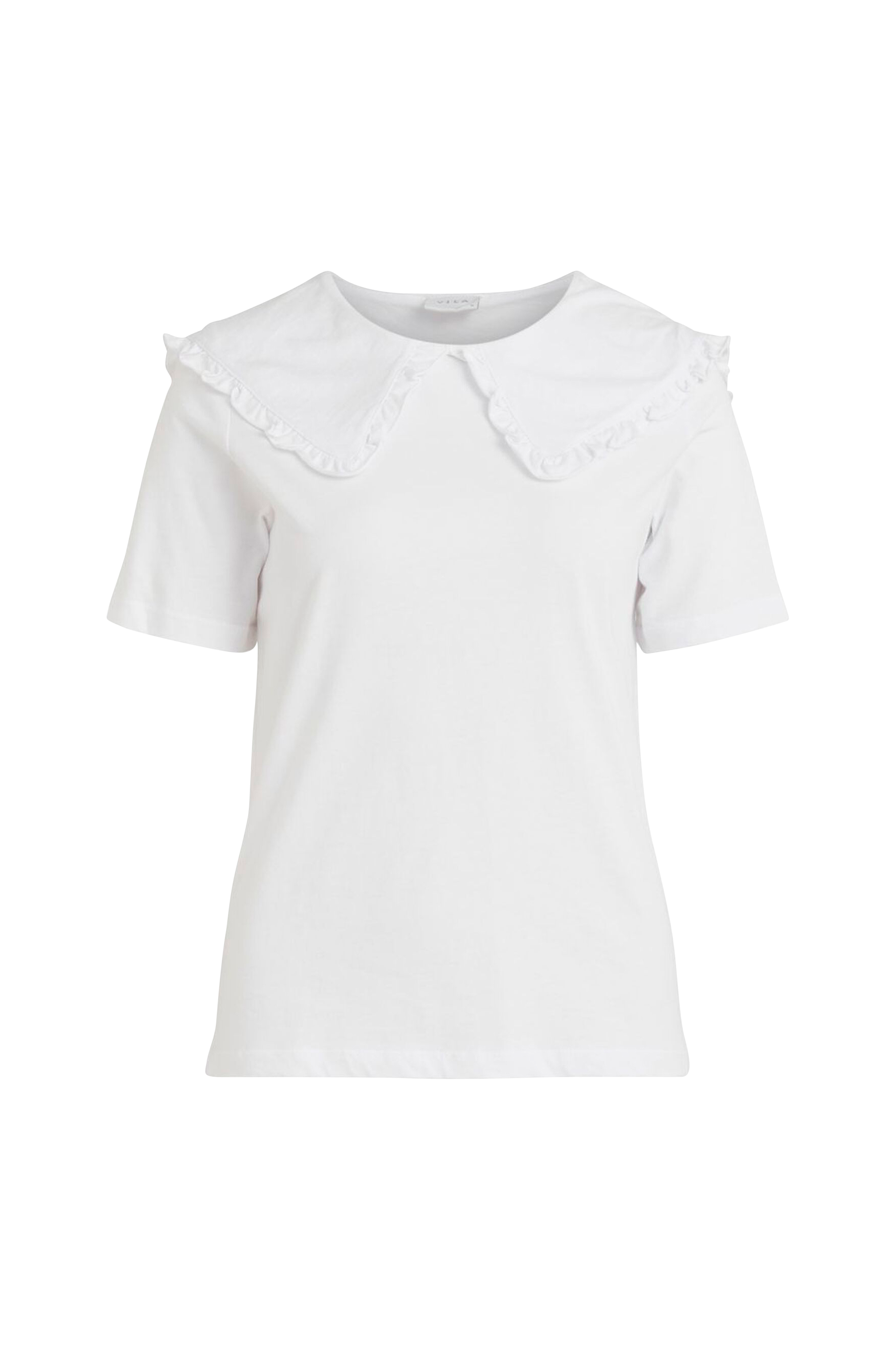 Lyhythihainen pusero, jossa leveä, edestä pyöristetty ja takaa nelikulmainen röyhelökaulus. Puuvillatrikoota.