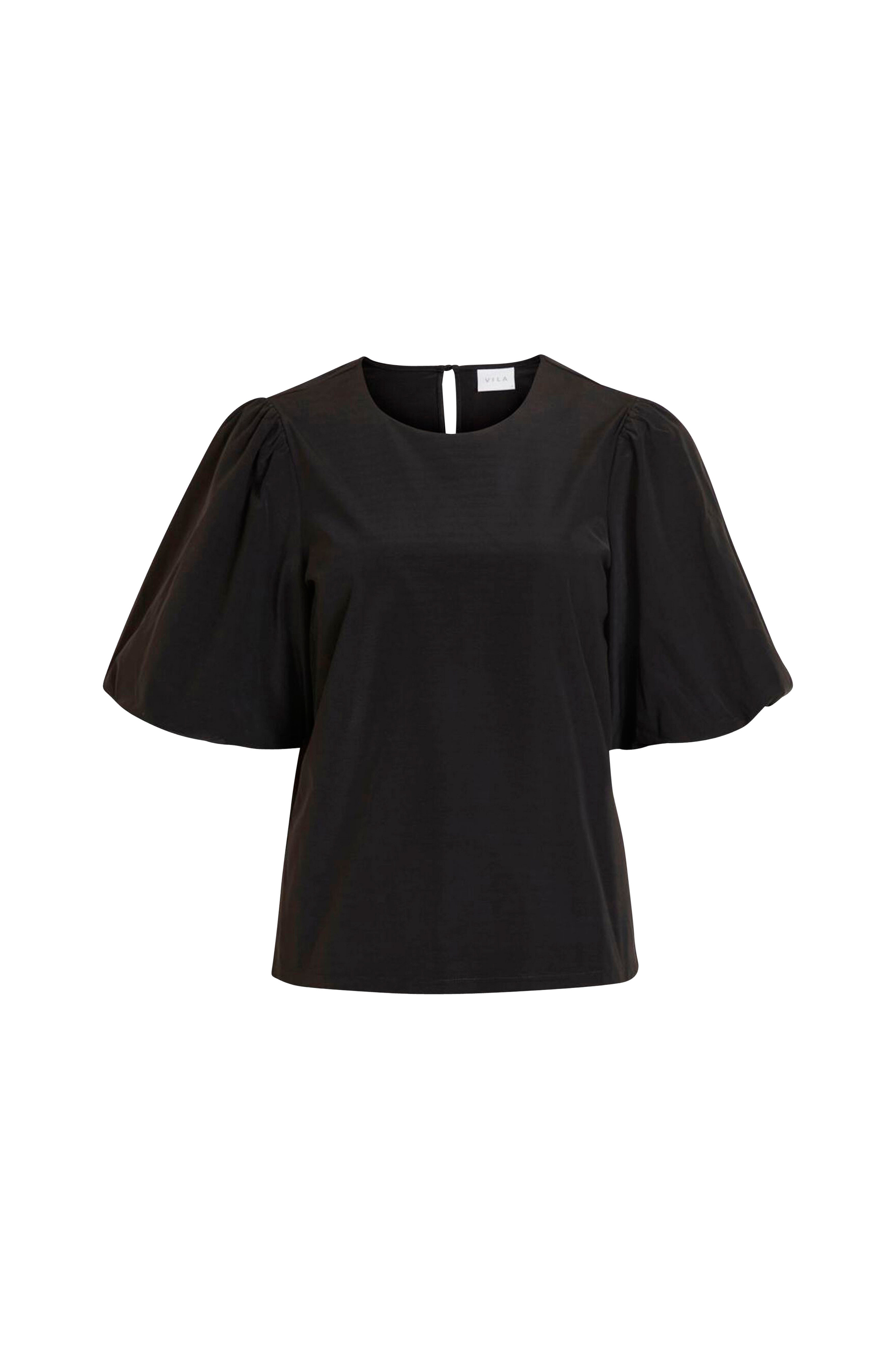 Suora malli stretchmateriaalia. Puolipitkät, leveät puhvihihat, joissa poimutus olkapäillä ja kuminauha hihansuissa. Pyöreä pääntie, jossa halkio ja nappi niskassa.