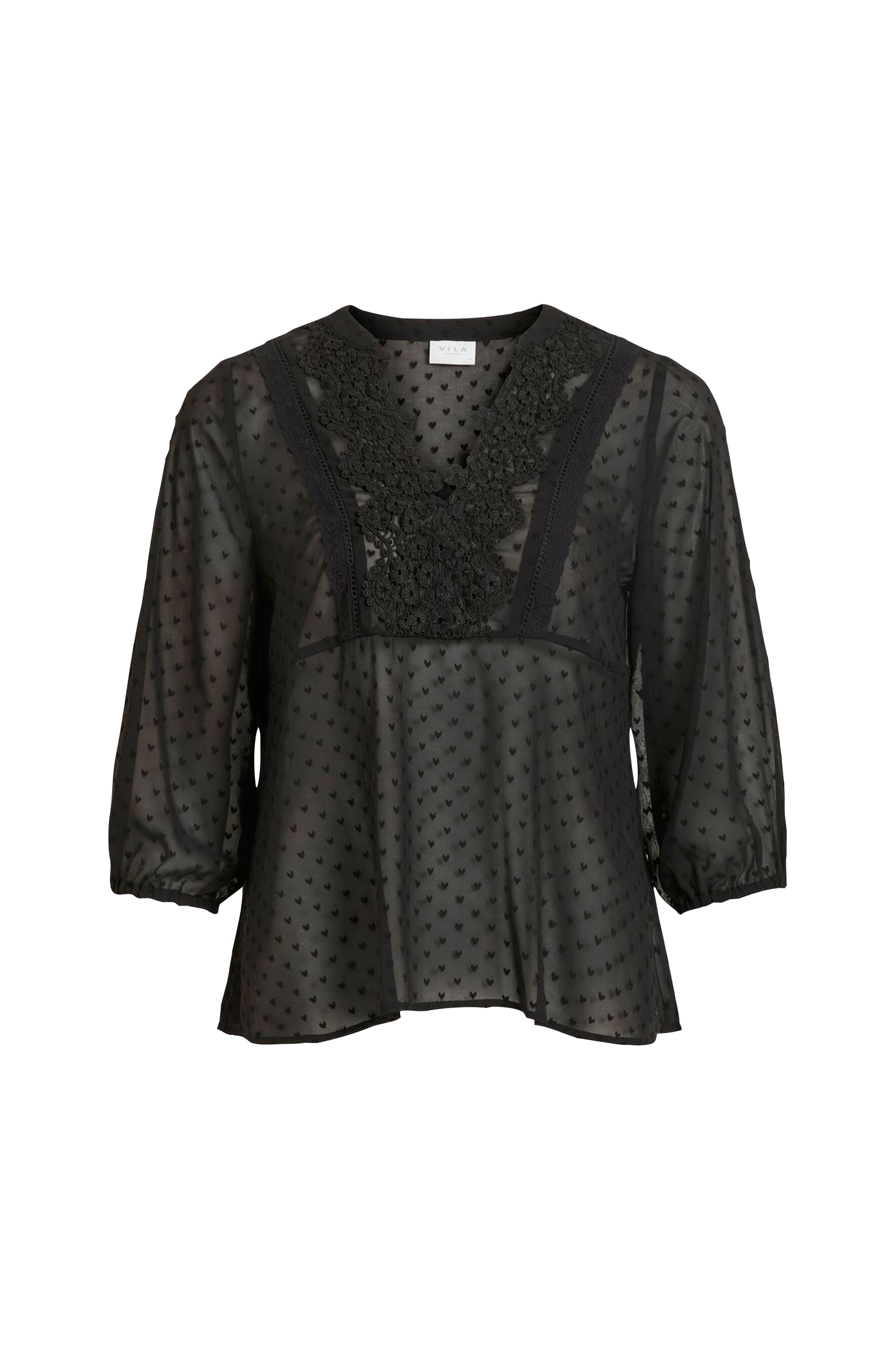 Vila viMosi 3/4 Top -pusero. Oversize-malli, jossa poikkileikkaus vyötäröllä ja leveä helma. V-pääntie, päälleommellut pitsisomisteet rinnassa ja suorat 3/4-pituiset hihat, joissa upotettu kuminauha hihansuissa. Sifonkia, jossa pilkullinen pintakuvio.