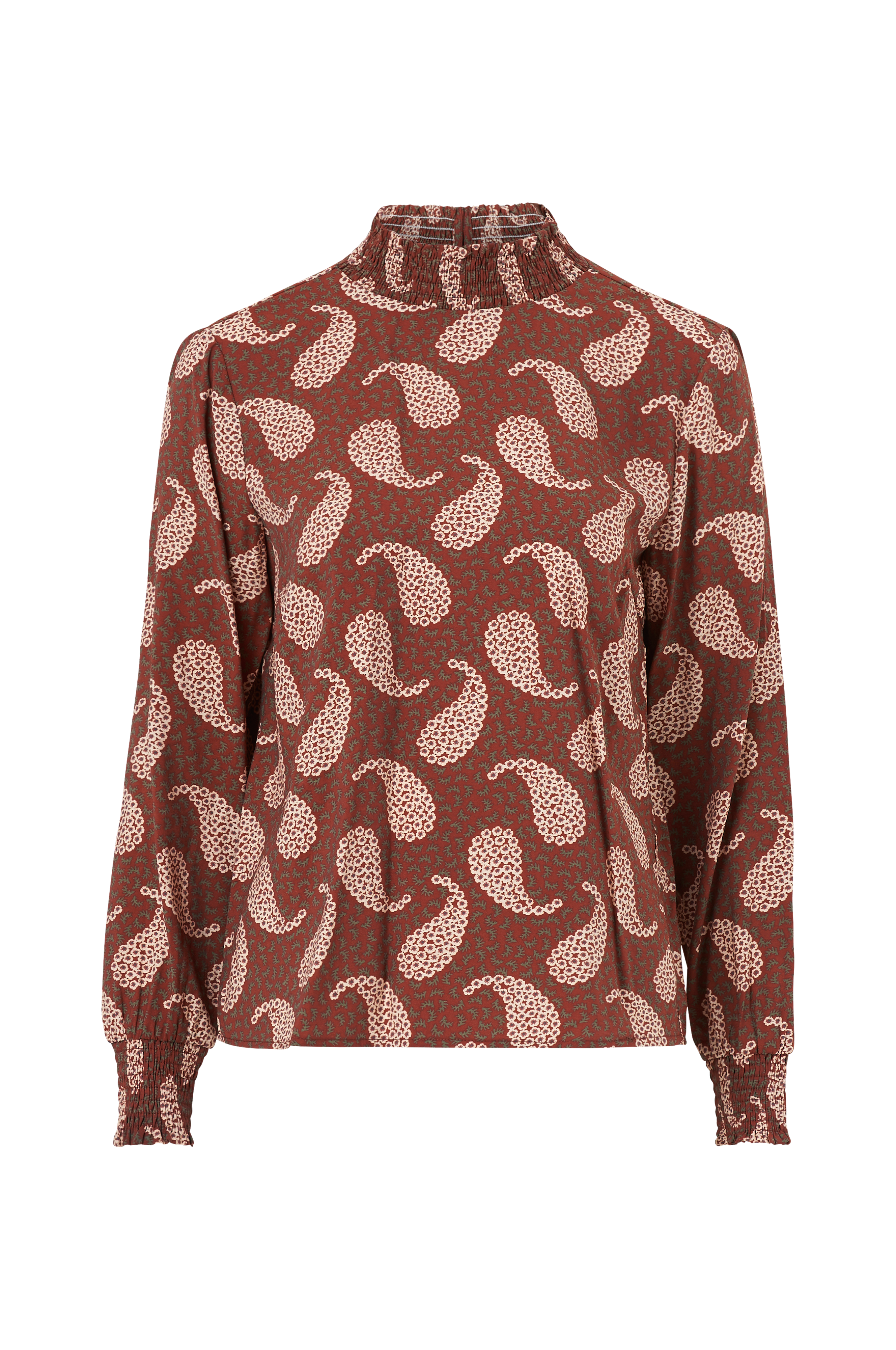Vila viOti L/S Top -pusero. Suora malli painokuvioista materiaalia. Korkea smokkirypytetty kaulus, jossa halkio ja napit niskassa. Pitkät hihat, hihansuissa smokkirypytys.
