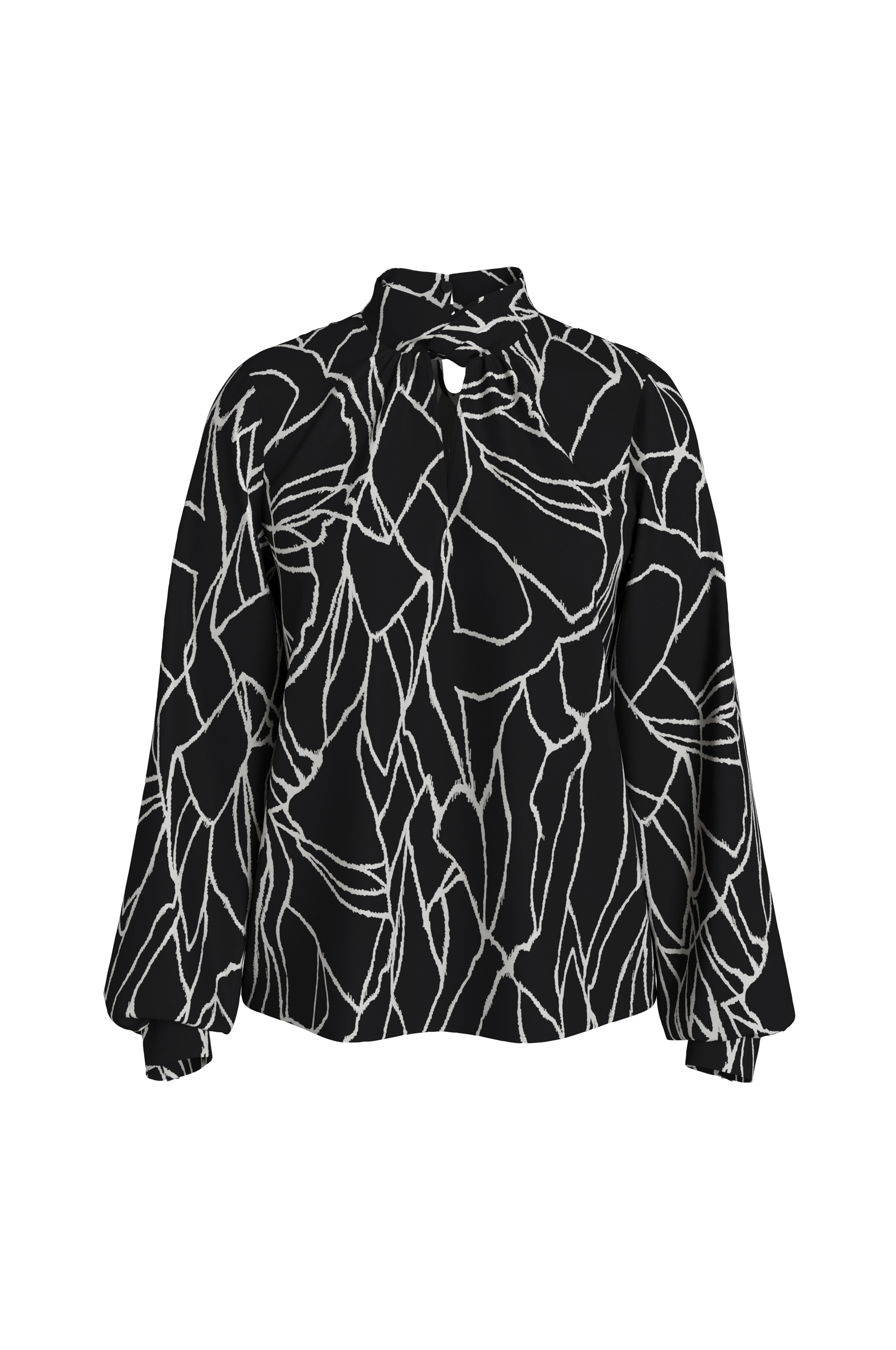 • Viskoosipusero, jossa painettu kuvio • Rako kahdella napilla niskan kohdalla • Rako ylhäällä edessä • Yksi nappi hihansuissa • Puoliksi läpinäkyvä kangas