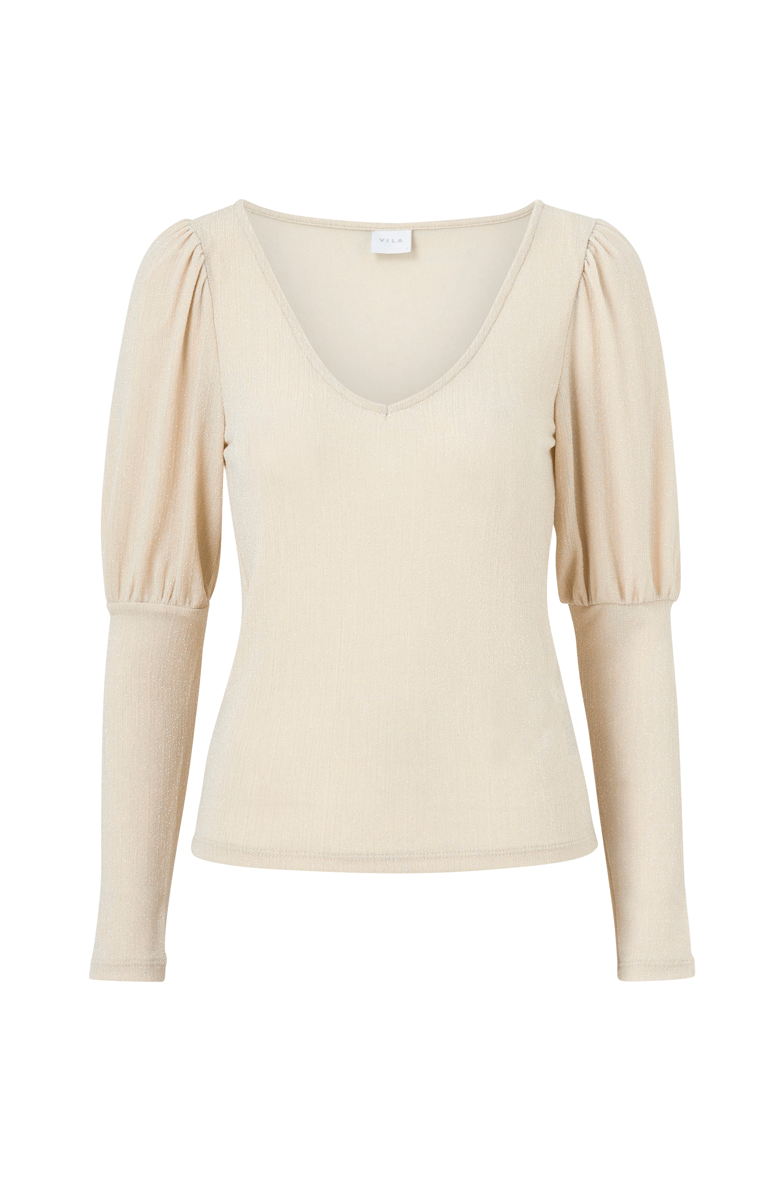 Vila viShinni Glitter V-neck L/S Top -pusero kimaltavaa trikoota. Kapea malli, jossa V-pääntie edessä ja pitkät puhvihihat.