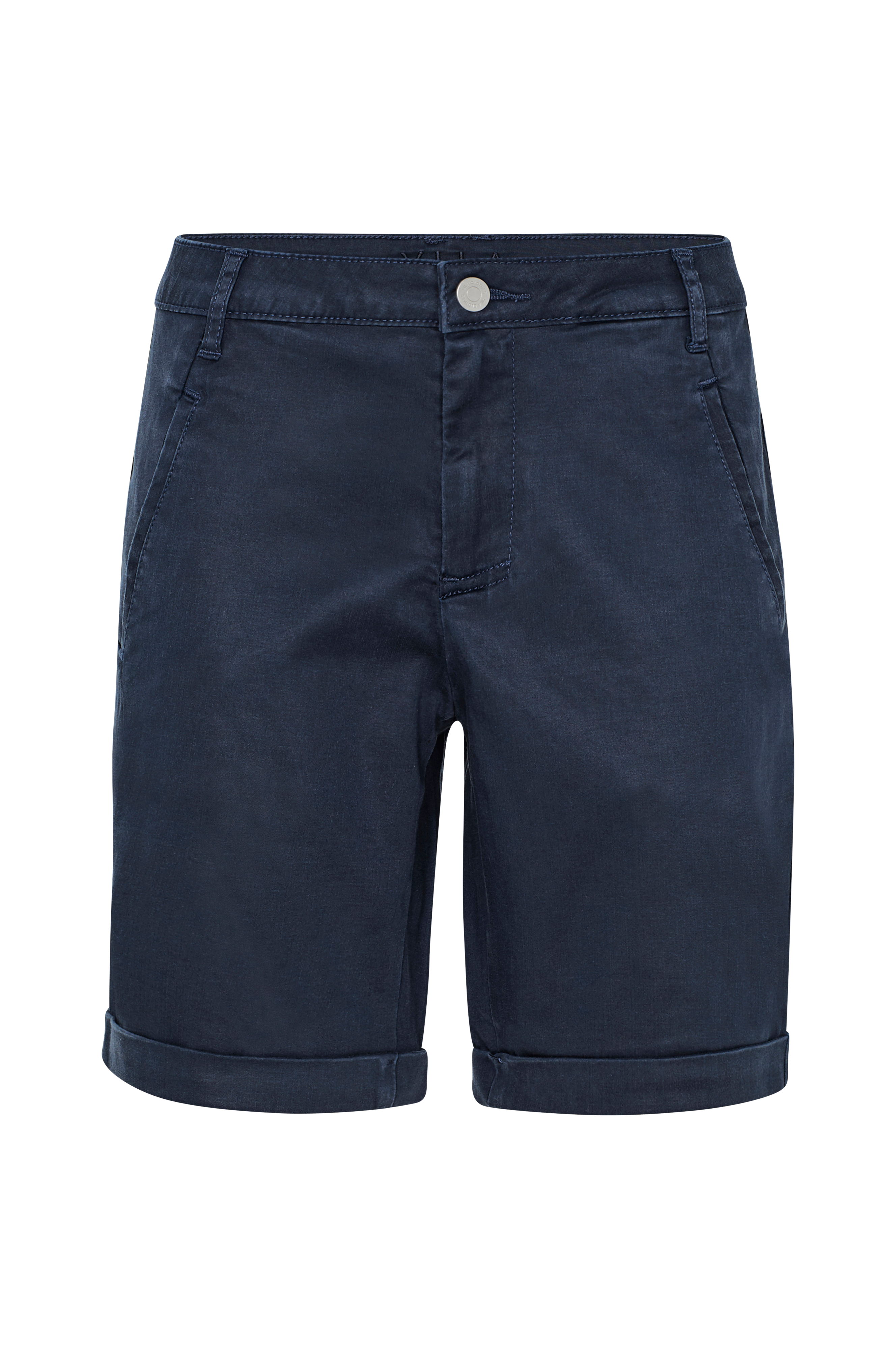 Vila viChino New -shortsit. Tyylikäs chinomalli, jossa sileä etuosa. Päälle ommeltu vyötärönauha, jossa vyölenkit ympäriinsä ja edessä nappi. Vetoketju etuhalkiossa. Kaksi etutaskua ja kaksi valetakataskua. Kiinniommeltu käänne lahkeensuissa. Miellyttävää stretchmateriaalia. Lahkeen sisäpituus n. 19,5 cm.