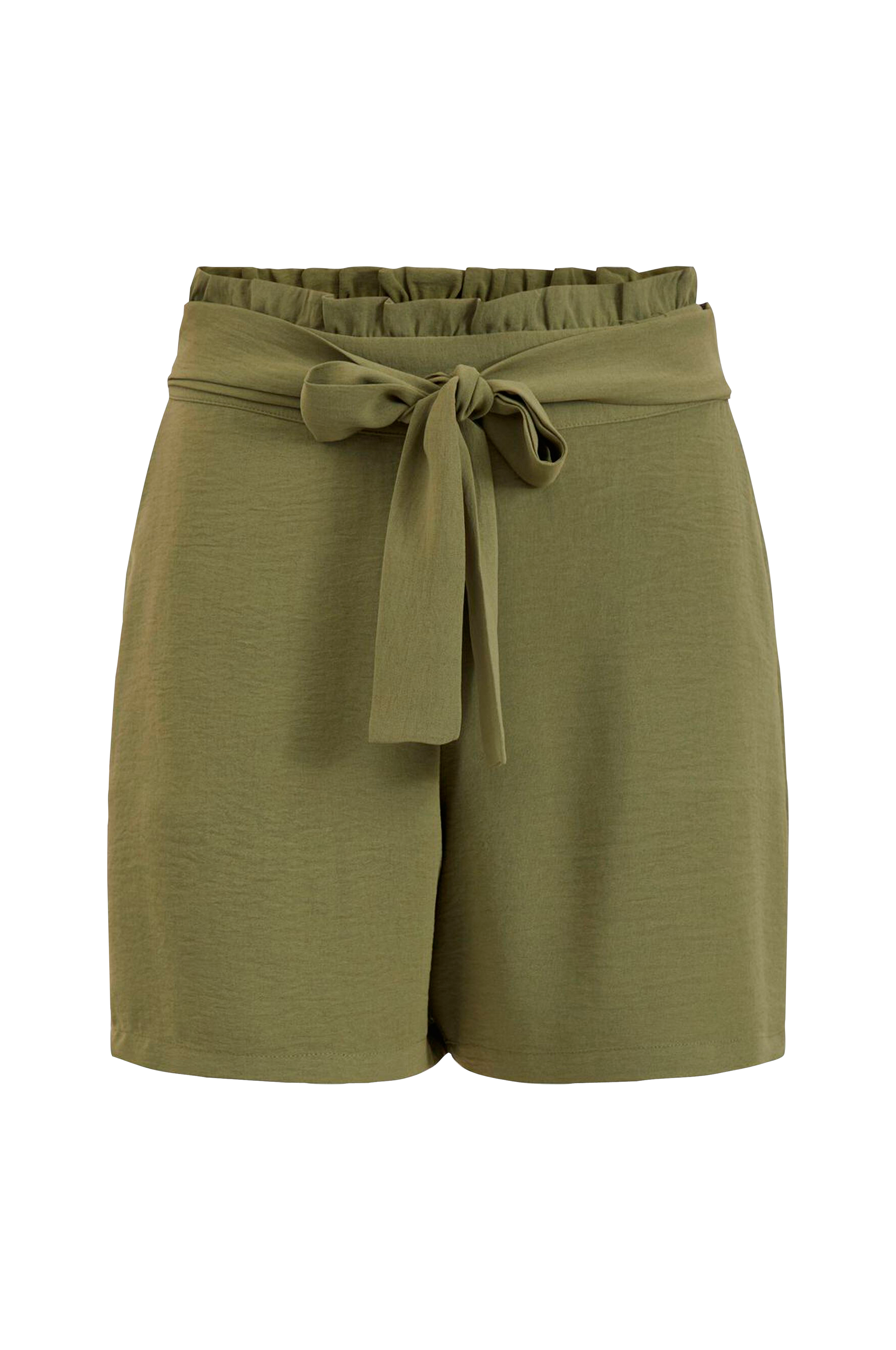 Shortsit, joissa rento malli ja suorat lahkeet. Korkea vyötärö ja edestä sileä vyötärönauha, jossa upotettu kuminauha takana, sivuilta kiinniommeltu solmimisvyö ja röyhelöreuna ylhäällä. Kaksi viistoa etutaskua. Lahkeen sisäpituus n. 11 cm koossa 36.