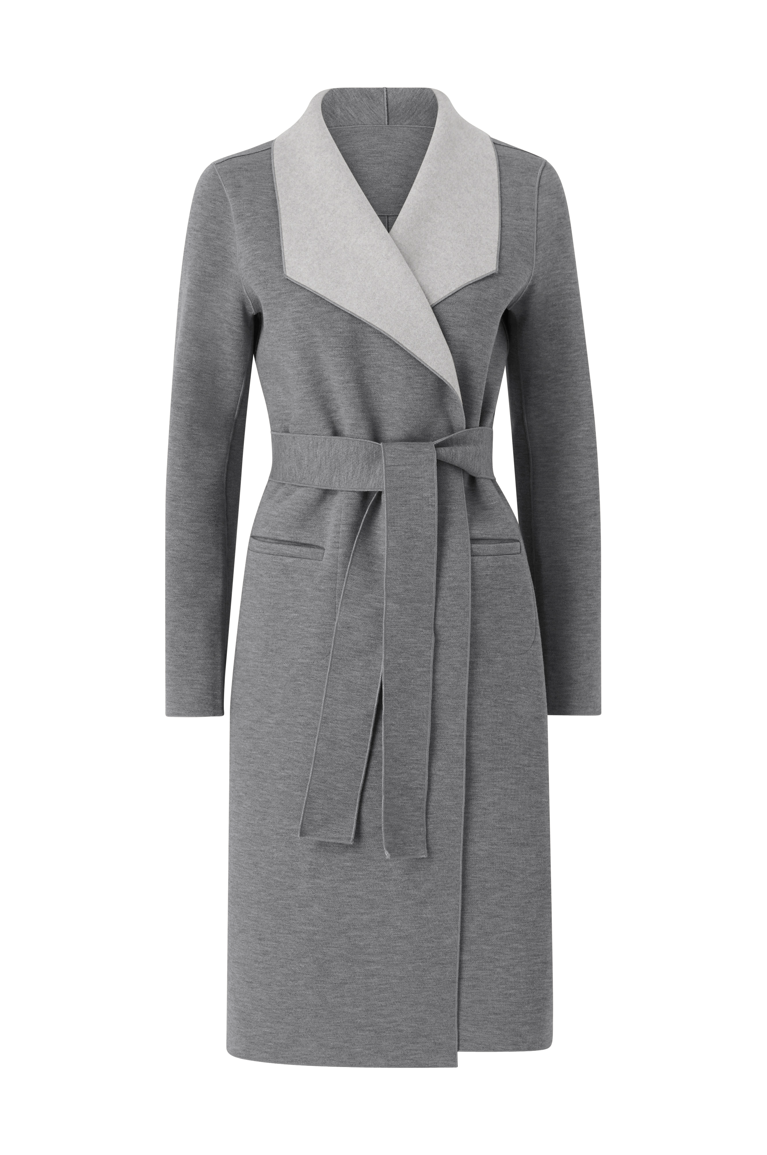 Käännettävä takki ohutta stretchmateriaalia. Toinen puoli sileä ja toinen pehmeä ja hieman huopamaisen tuntuinen. Avoin malli, jossa solmimisvyö vyötäröllä ja taskut edessä. Pituus n. 112 cm koossa S.