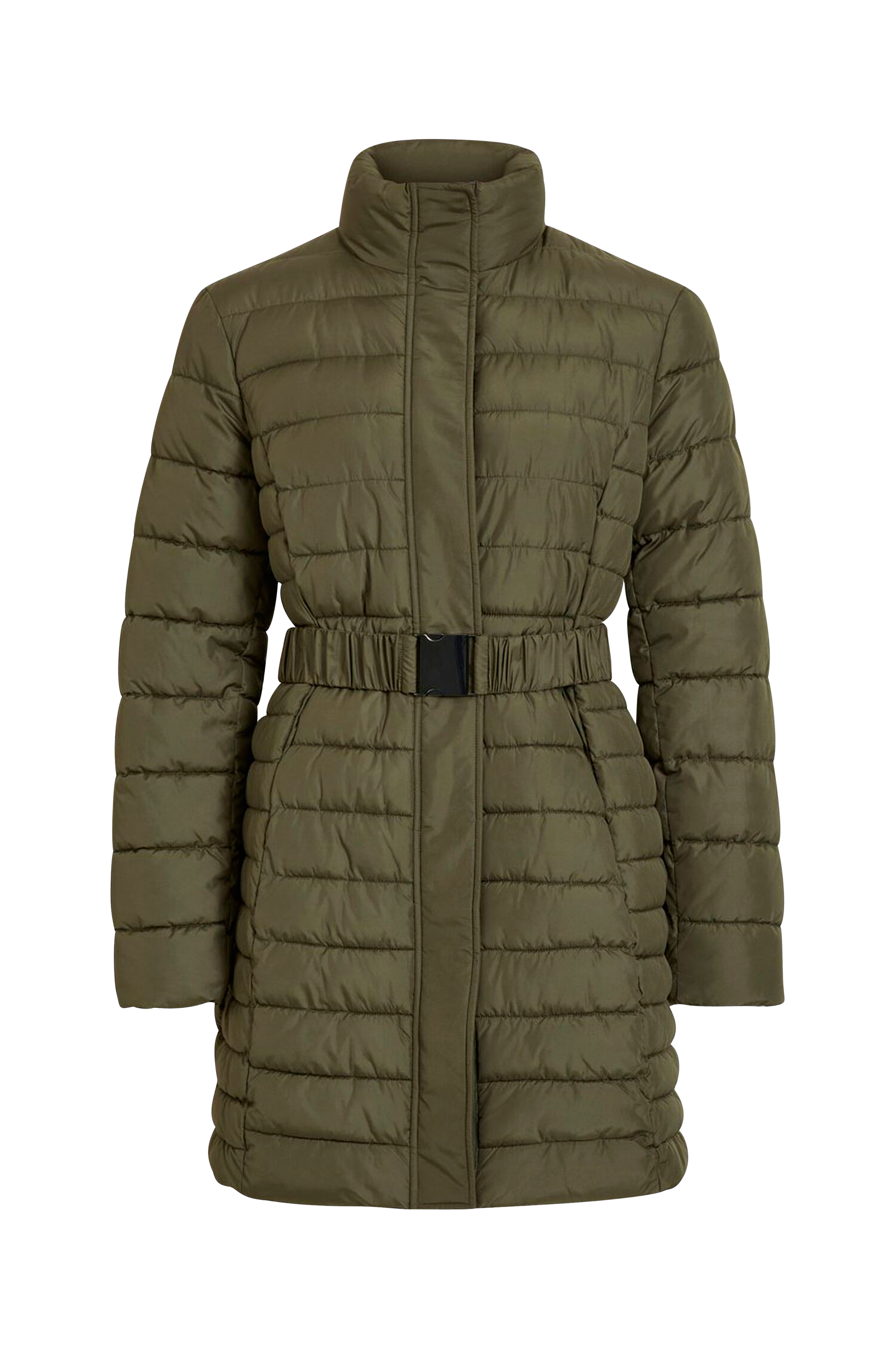 Vila viMasina Jacket -takki. Kevyesti levenevä topattu malli, jossa metallisoljellinen kuminauhavyö vyötäröllä. Nappilistassa kaksisuuntainen piilovetoketju ja painonappi ylös korkeaan kaulukseen asti. Kaksi upotettua taskua ja hihansuiden sisäpuolella kuminauha. Pituus noin 87 cm koossa 36.