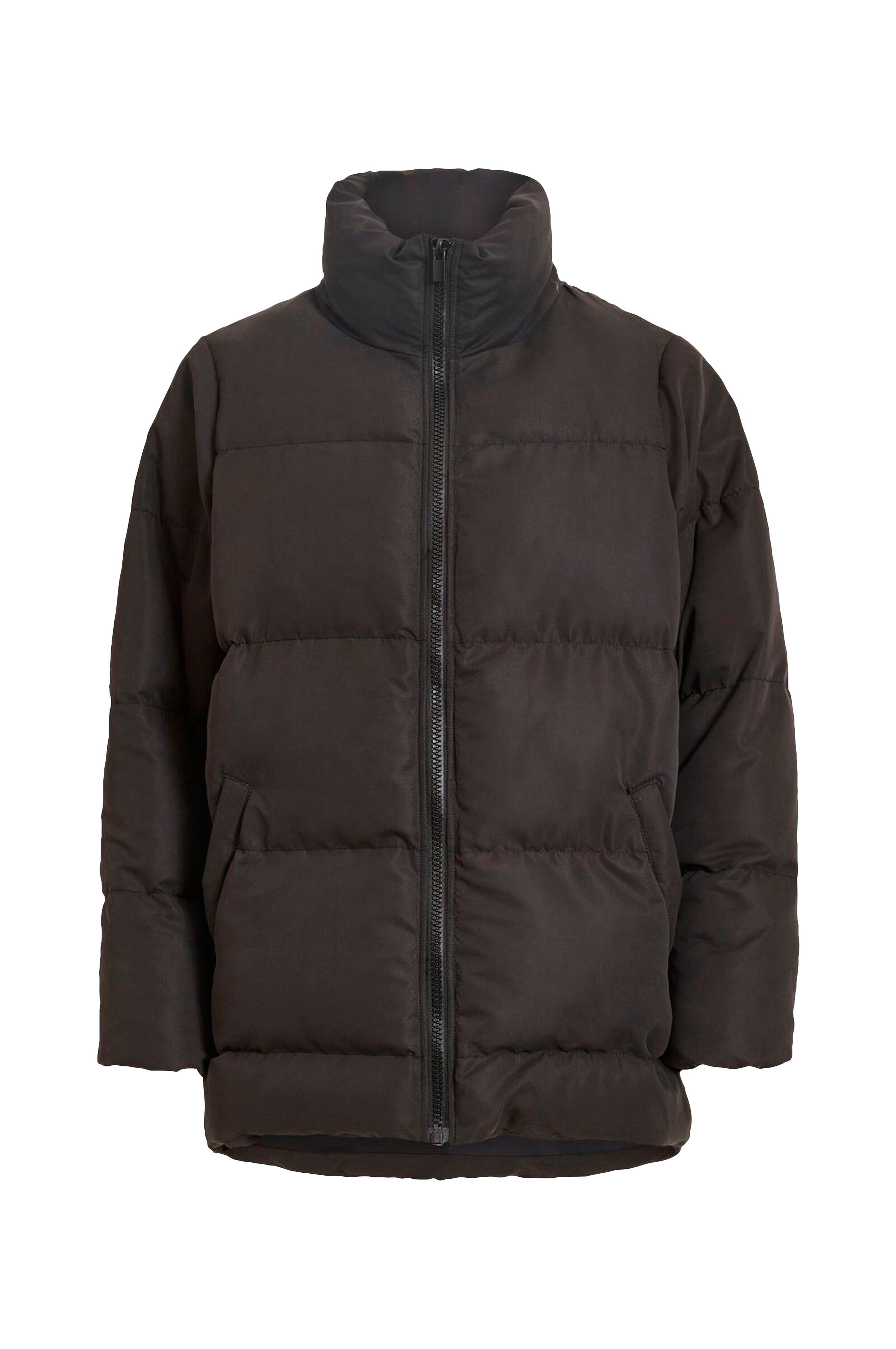 Vila viTrust Volume Jacket -takki. Topattu oversize-malli, jossa vetoketju ja etutaskut. Korkea pääntie ja hihansuissa piilokuminauha. Takki on takaa hieman pidempi. Pituus edestä n. 72 cm koossa 36.