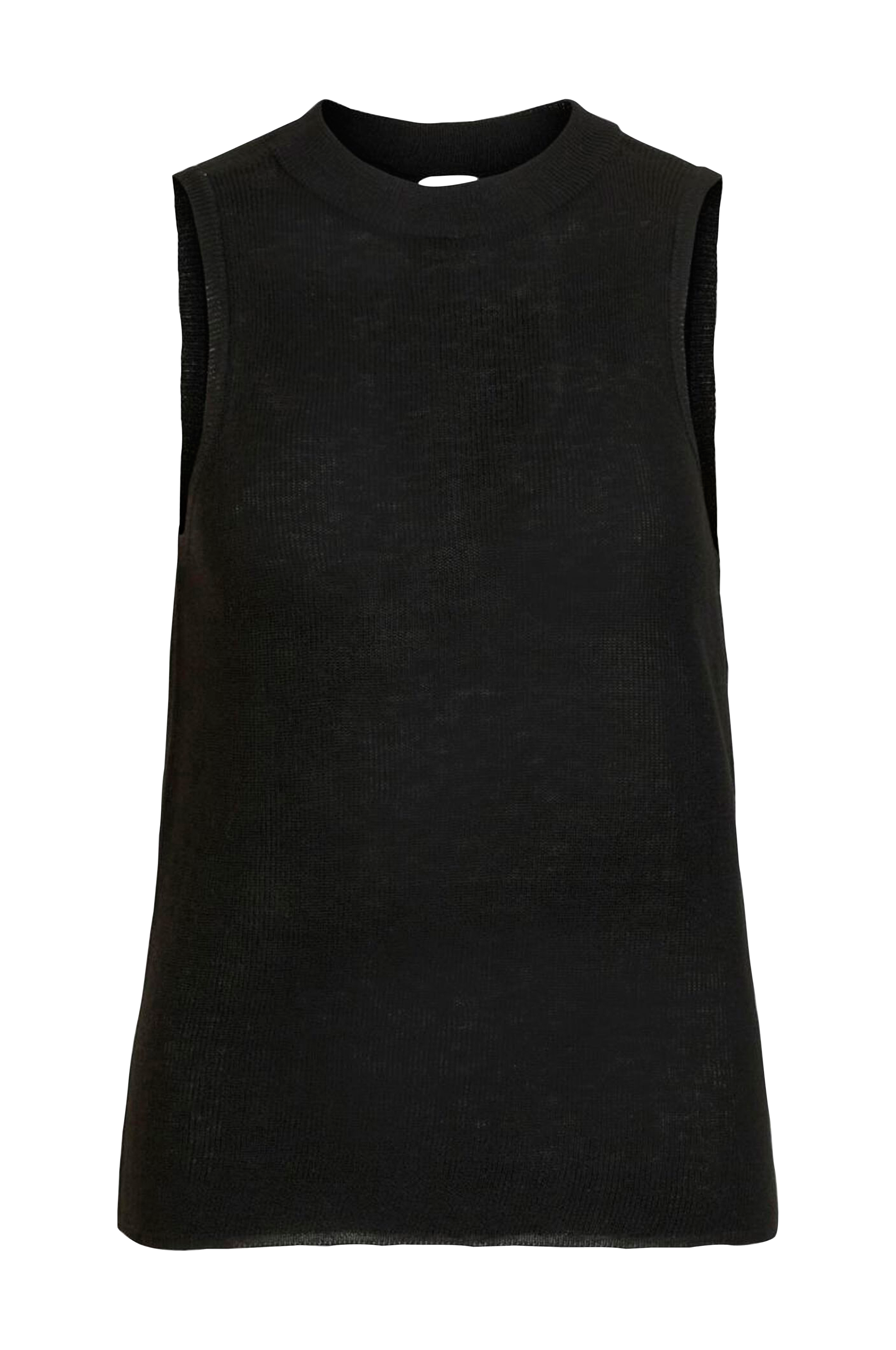 Ohut hihaton neulospusero, jossa korkea joustinneulospääntie ja aukko takana.
