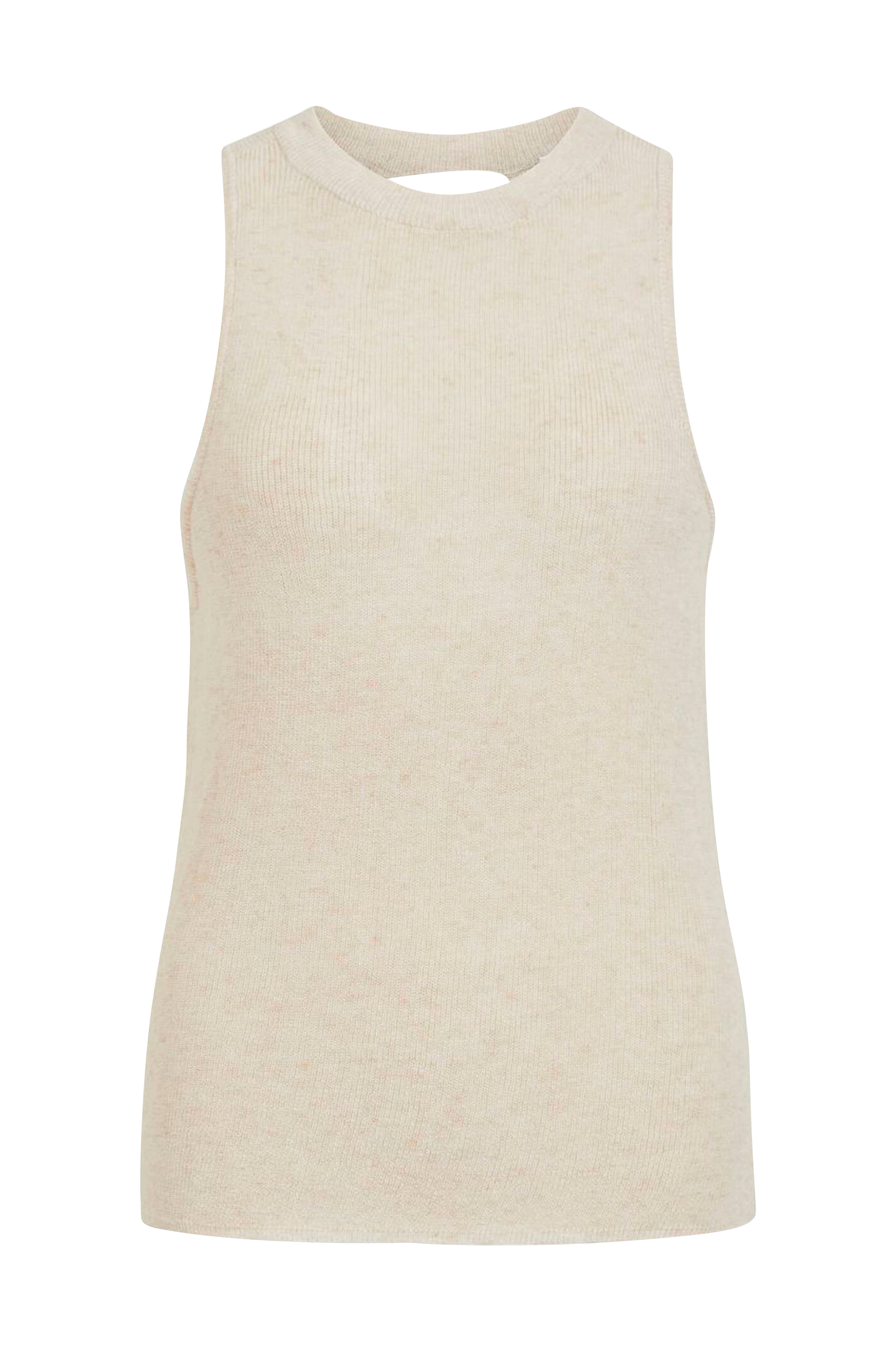 Ohut hihaton neulospusero, jossa korkea joustinneulospääntie ja aukko takana.