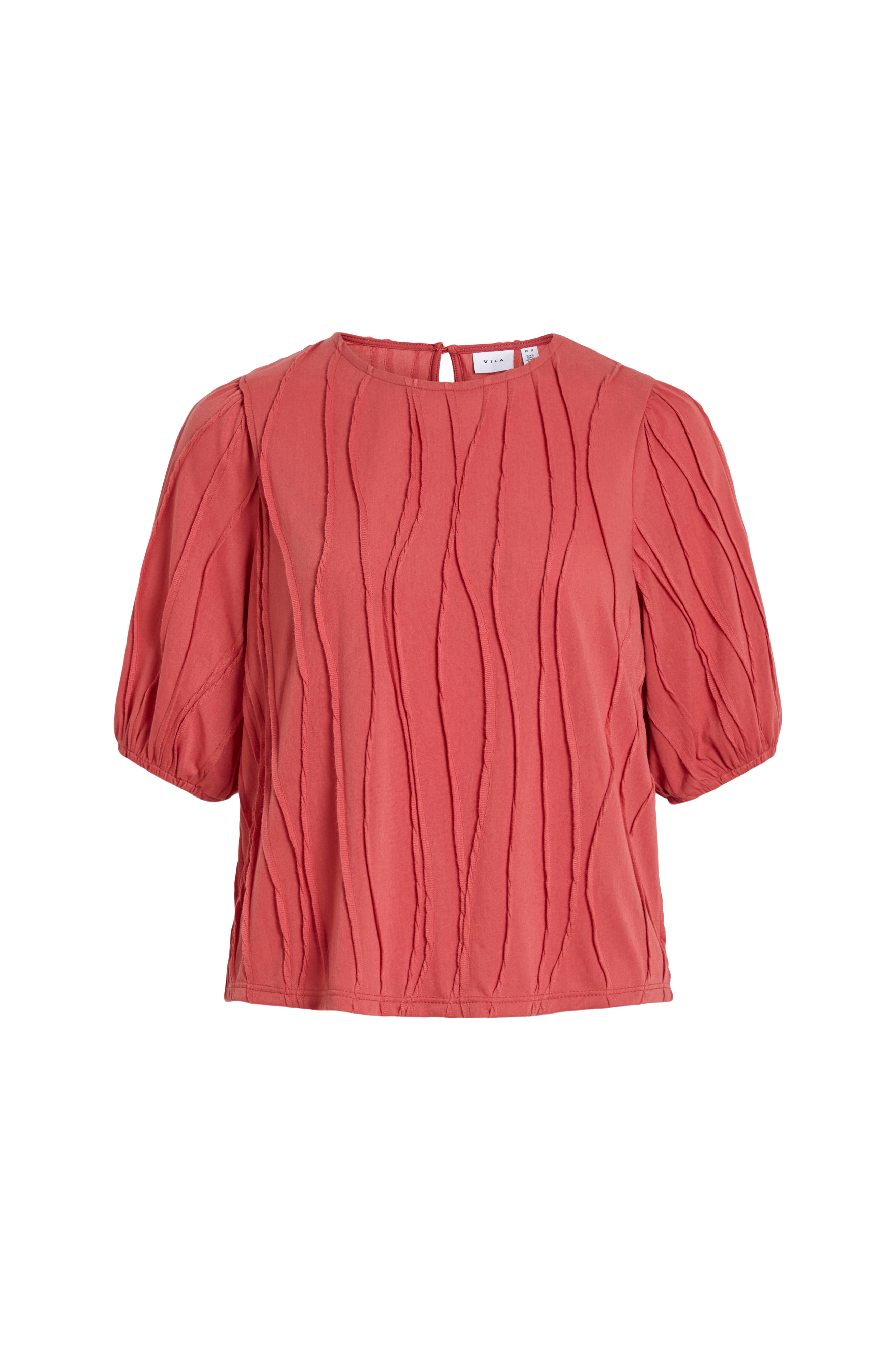 • Lyhythihainen toppi pehmeästä materiaalista• Kangas ommelluilla laskoksilla• Pallohiha kuminauhalla hihansuissa• Pieni rako niskan kohdalla pienellä napilla