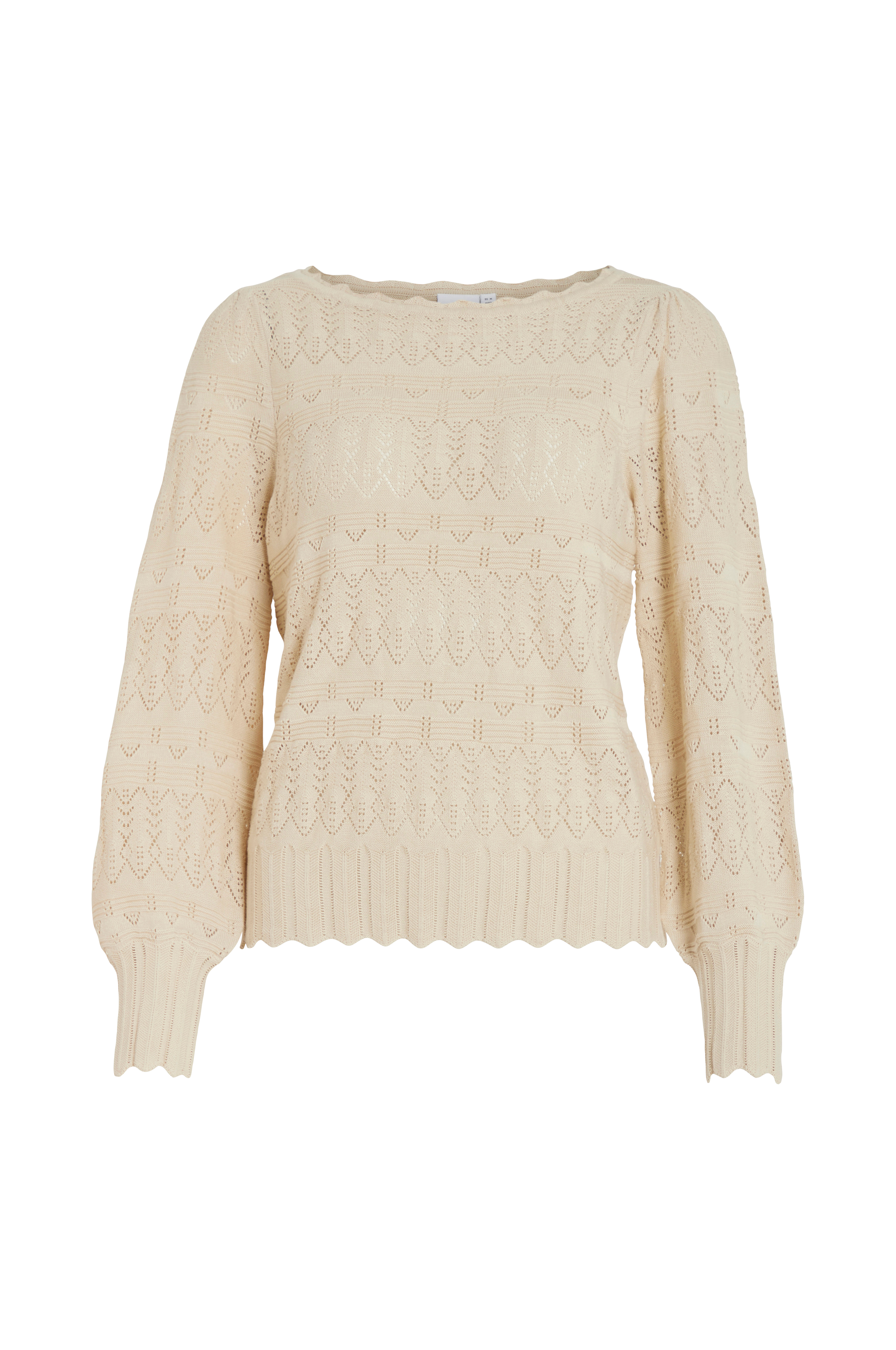 • Kuvioneulottu malli• Pitkä, leveä hiha rypytyksellä olkapäissä• Aaltoilevat reunat