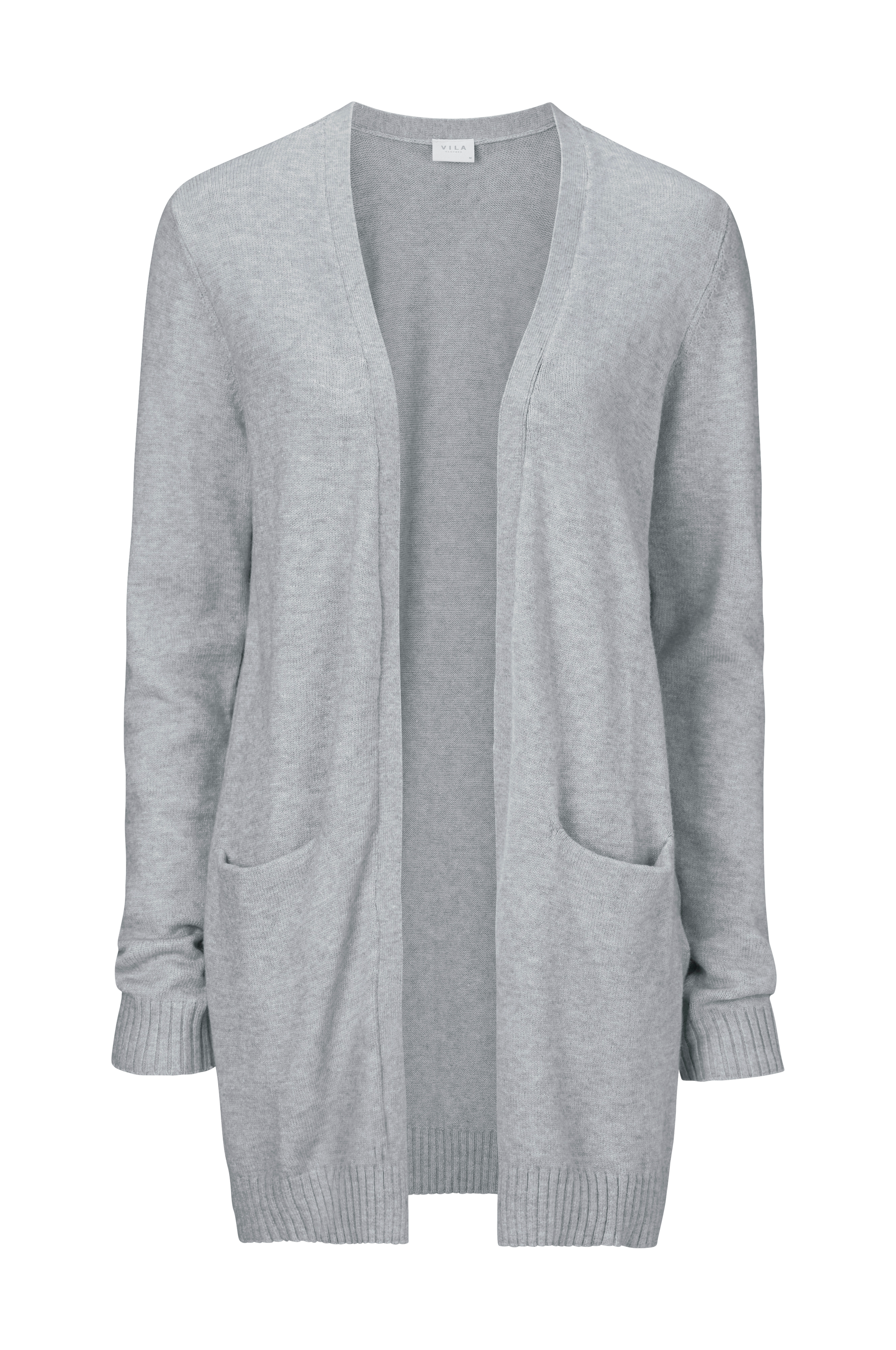 Vila viRil L/S Open Knit -neuletakki. Pitkä ja napiton malli. Neulosreuna edessä. Kaksi upotettua taskua, paksuvakoinen reuna hihansuissa ja helmassa. Pituus n. 84 cm koossa M.