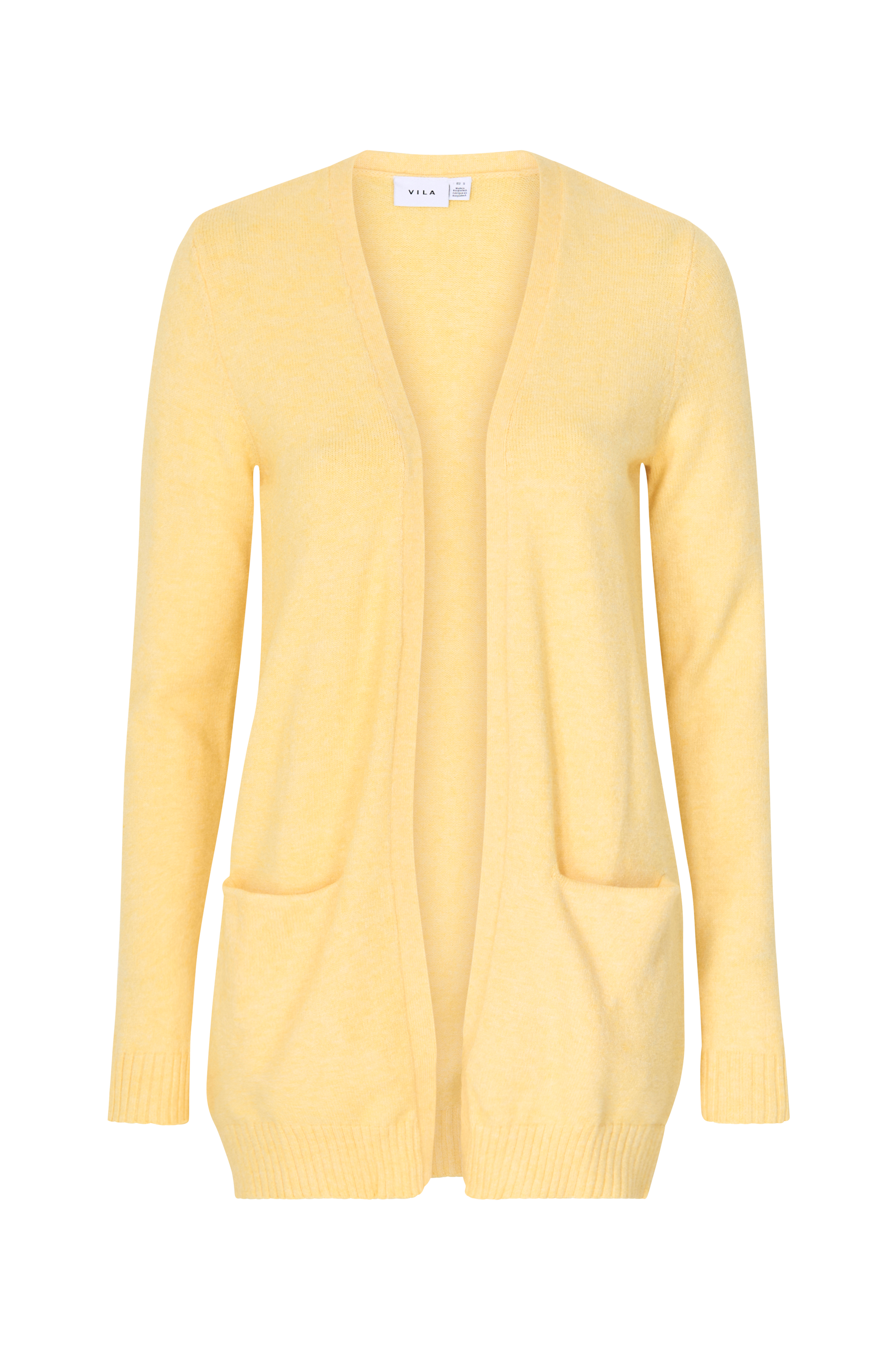 Vila viRil L/S Open Knit -neuletakki. Pitkä ja napiton malli. Neulosreuna edessä. Kaksi upotettua taskua, paksuvakoinen reuna hihansuissa ja helmassa. Pituus n. 84 cm koossa M.