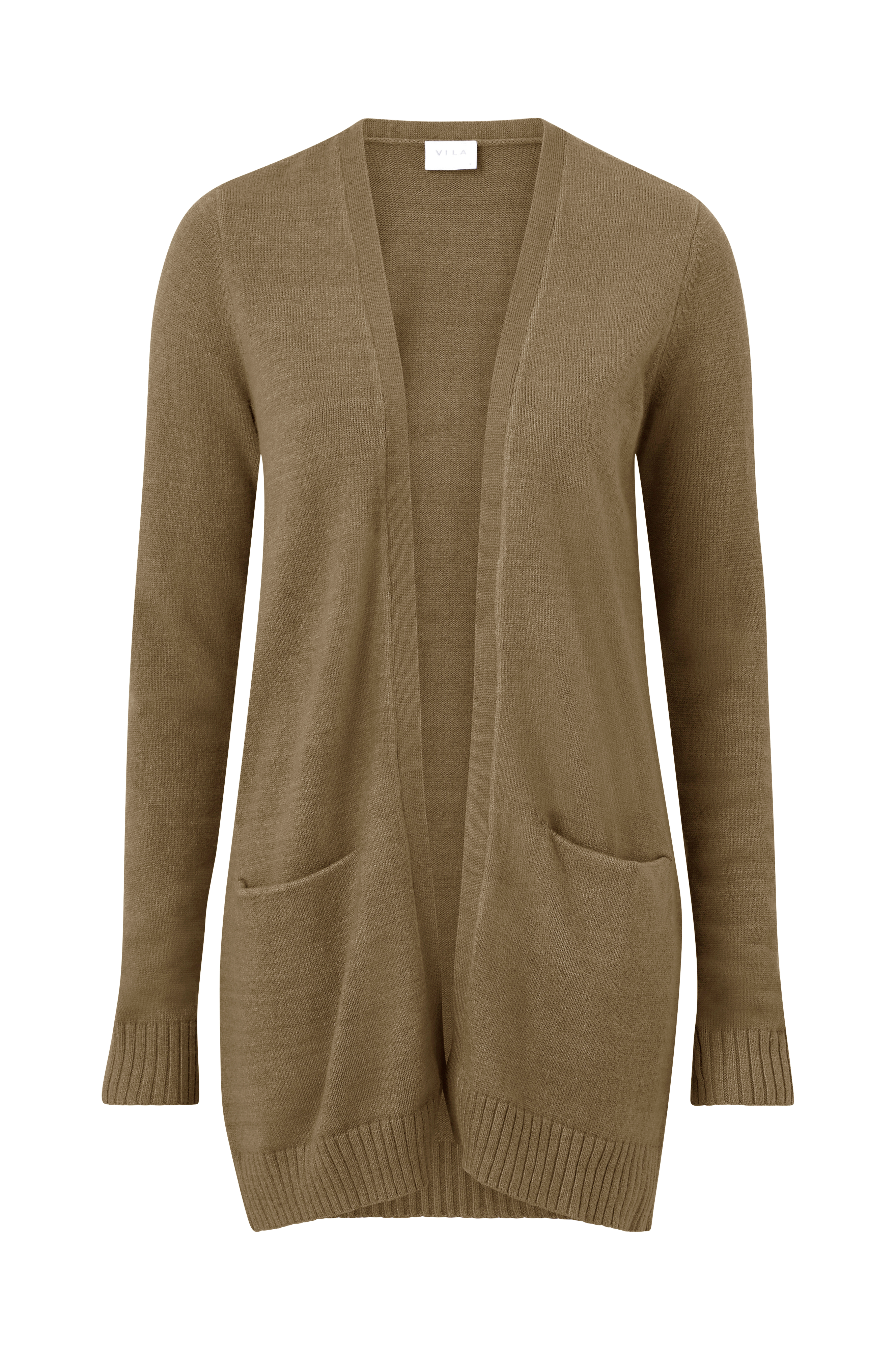 Vila viRil L/S Open Knit -neuletakki. Pitkä ja napiton malli. Neulosreuna edessä. Kaksi upotettua taskua, paksuvakoinen reuna hihansuissa ja helmassa. Pituus n. 84 cm koossa M.