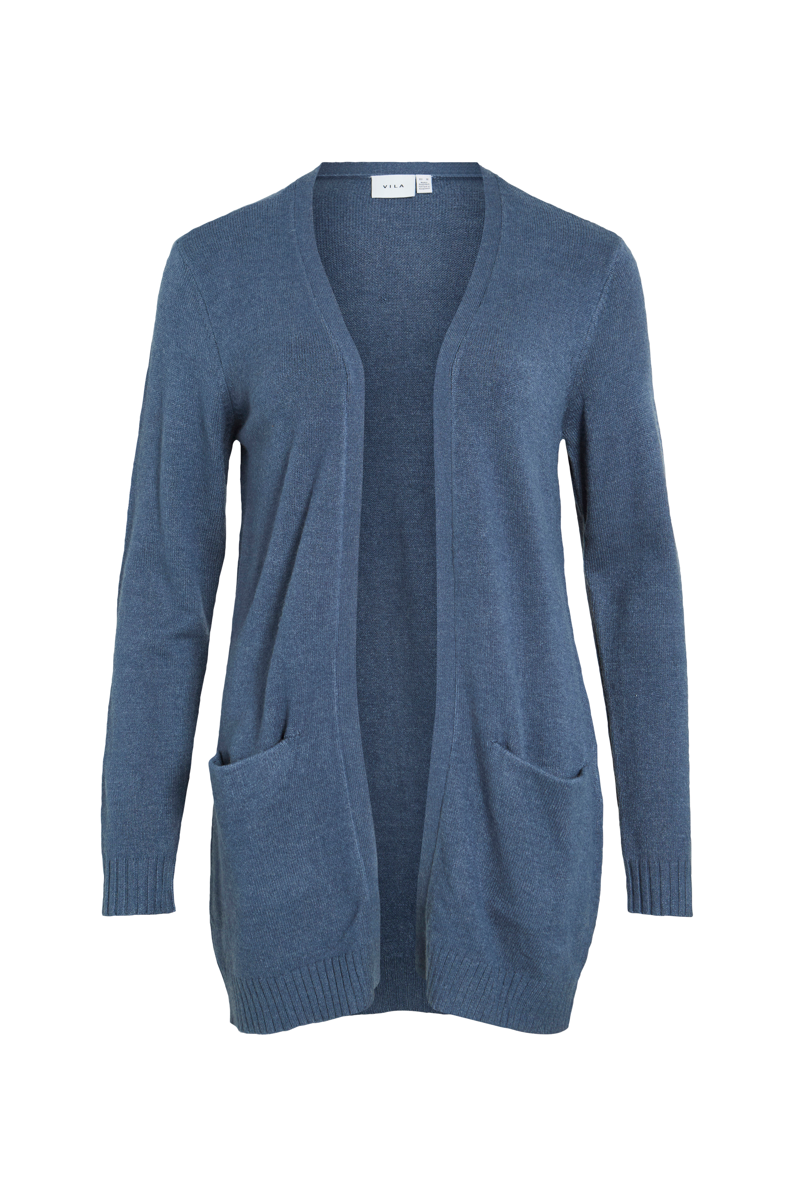 Vila viRil L/S Open Knit -neuletakki. Pitkä ja napiton malli. Neulosreuna edessä. Kaksi upotettua taskua, paksuvakoinen reuna hihansuissa ja helmassa. Pituus n. 84 cm koossa M.