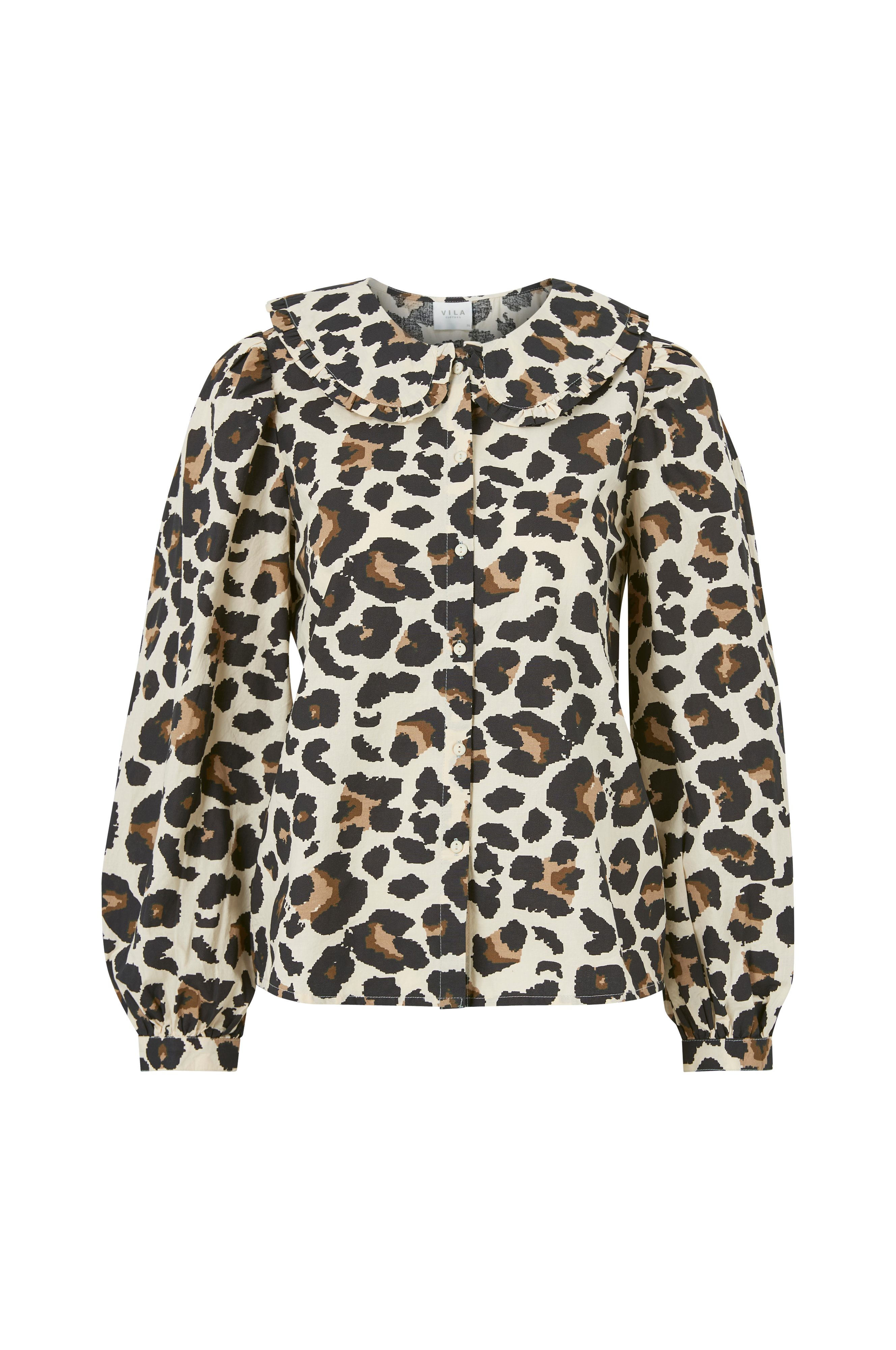 Paita, jossa on röyhelökaulus ja pitkät pussihihat sekä kapea kalvosin ja nappi hihansuissa. Kangasta.
