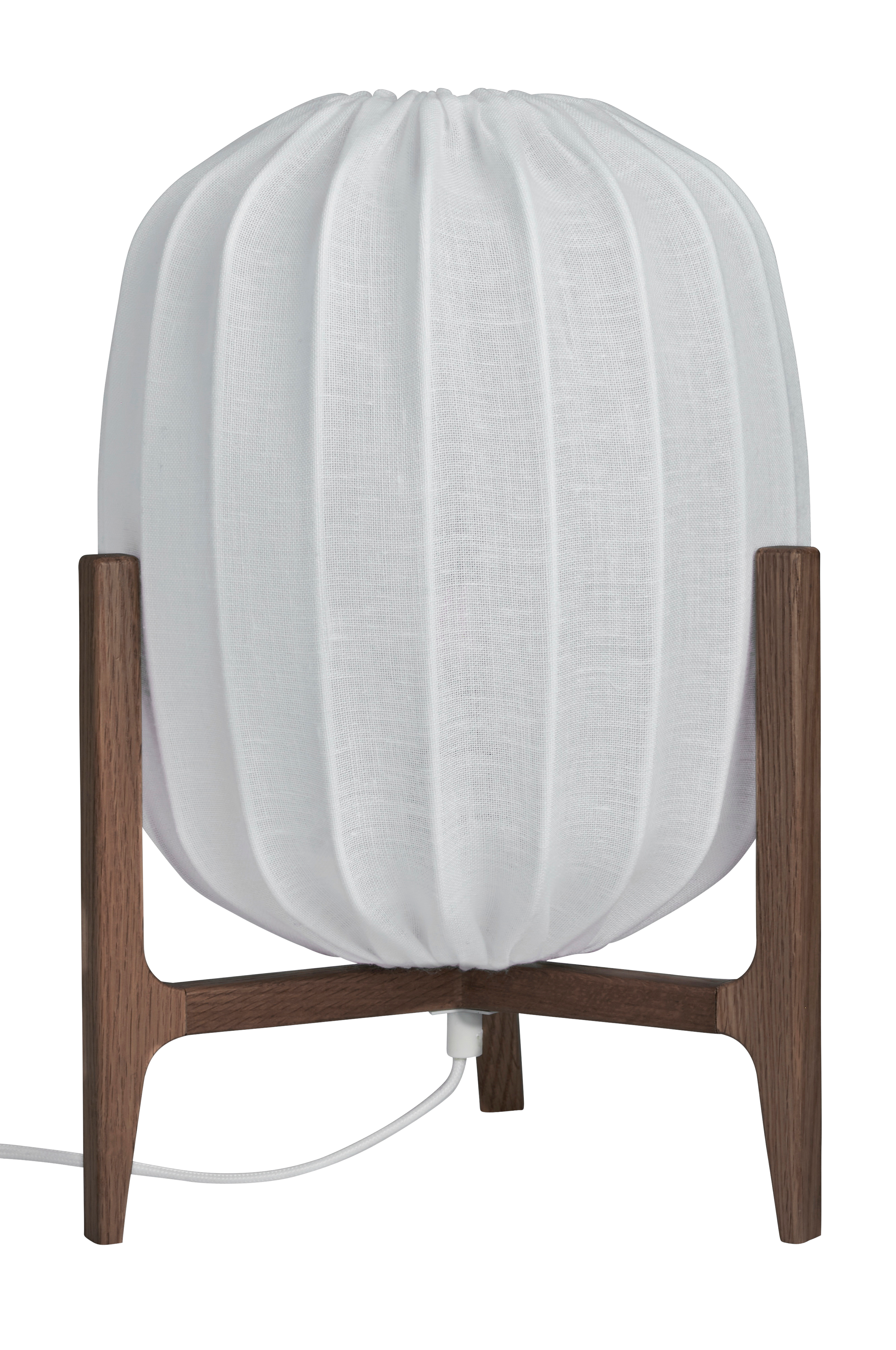 Prisma-pöytävalaisimen jalusta on öljyttyä tammea ja varjostin valkoista pellavakangasta. Pehmeä varjostin ja graafisen ilmeen antava teräsrunko muodostavat kontrastin lämpimälle puujalustalle, mikä antaa valaisimelle ylellisen rennon, moniin sisustustyyleihin sulautuvan ilmeen. Prisma-pöytävalaisimessa on himmentimellä varustettu kangasjohto, jotta voit valita joko tunnelmavalaistuksen tai voimakkaamman yleisvalon.