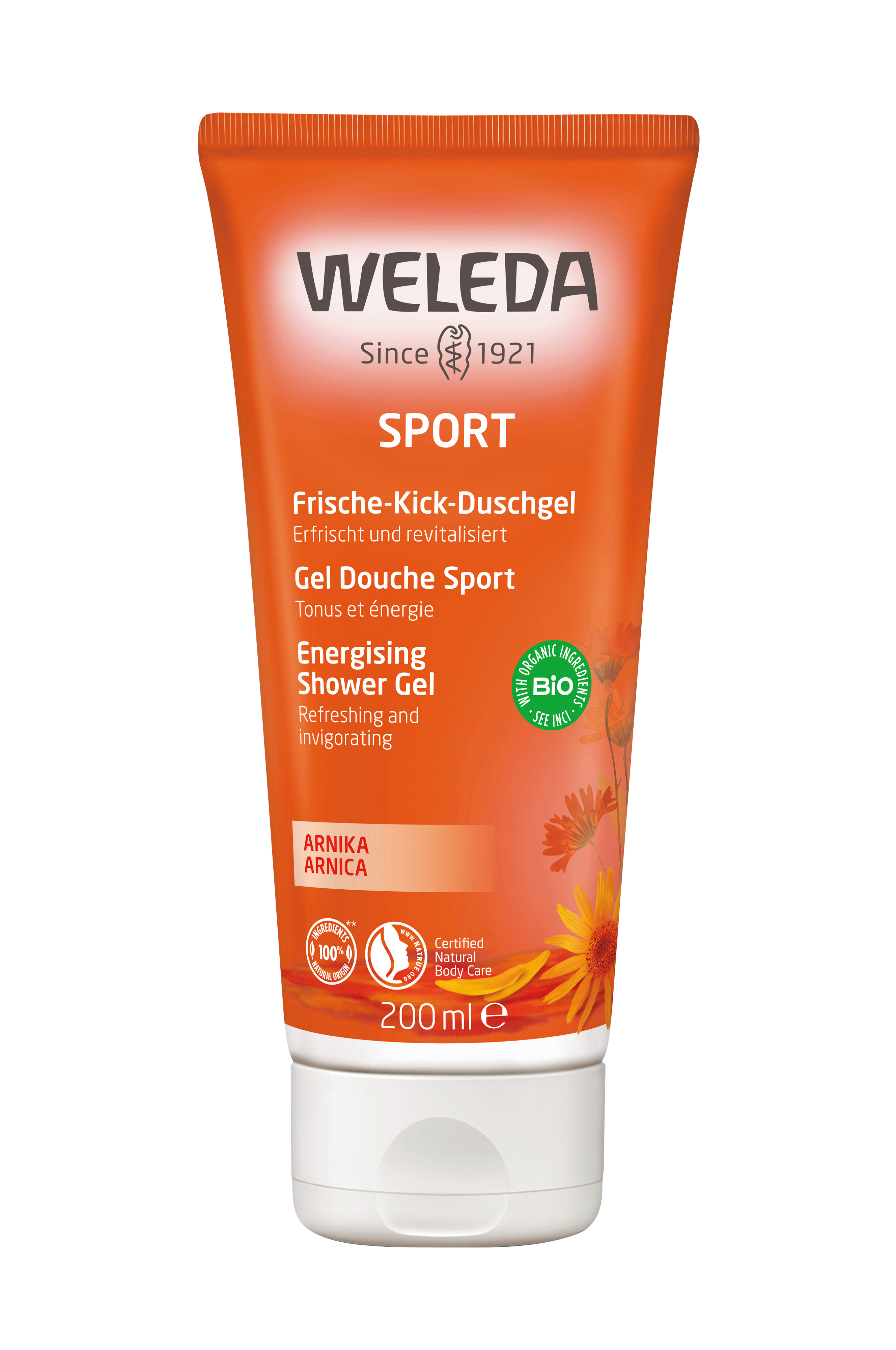 Weleda Arnica Sports Shower Gel -suihkugeeli on mieto ja ekologinen. Hoitaa ihon luonnollista kosteustasapainoa ja sopii hyvin sekä treenin jälkeen käytettäväksi että päivittäiseen puhdistukseen. Sisältää arnikkia, jota Weleda viljelee yhteistyössä WWF:n kanssa valvotuilla ja sertifioiduilla villiviljelytiloilla. Suihkugeeli puhdistaa ja kosteuttaa jättäen iholle miellyttävän rosmariinin ja laventelin tuoksun.