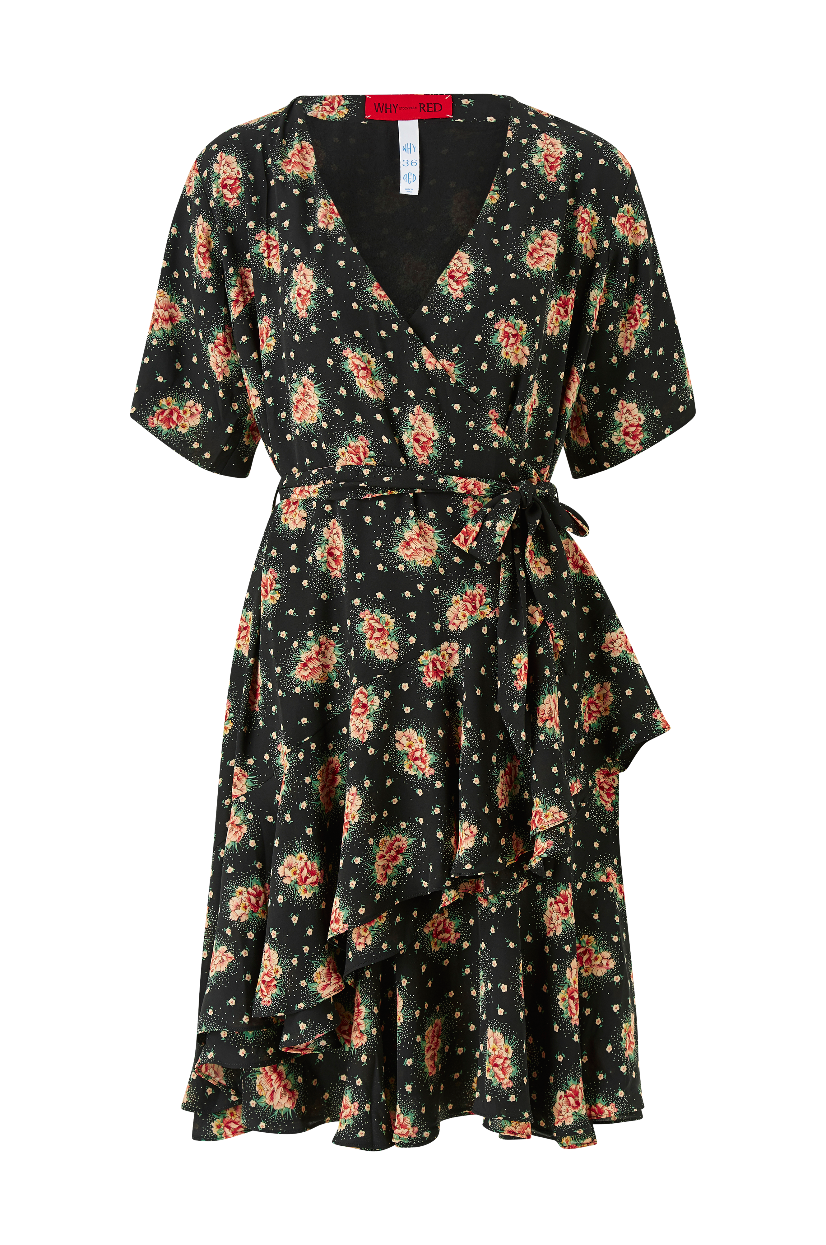 Whyred Danica Blossomy Dress -kietaisumekko. Avoin kietaisumalli, jossa sisä- ja ulkopuolella nappi. Vyölenkit ja solmimisvyö vyötäröllä. Lyhyet suorat hihat. Hameosassa päälleommeltu röyhelö etureunassa ja helmassa. Vuorillinen. Pituus n. 101 cm koossa 36.