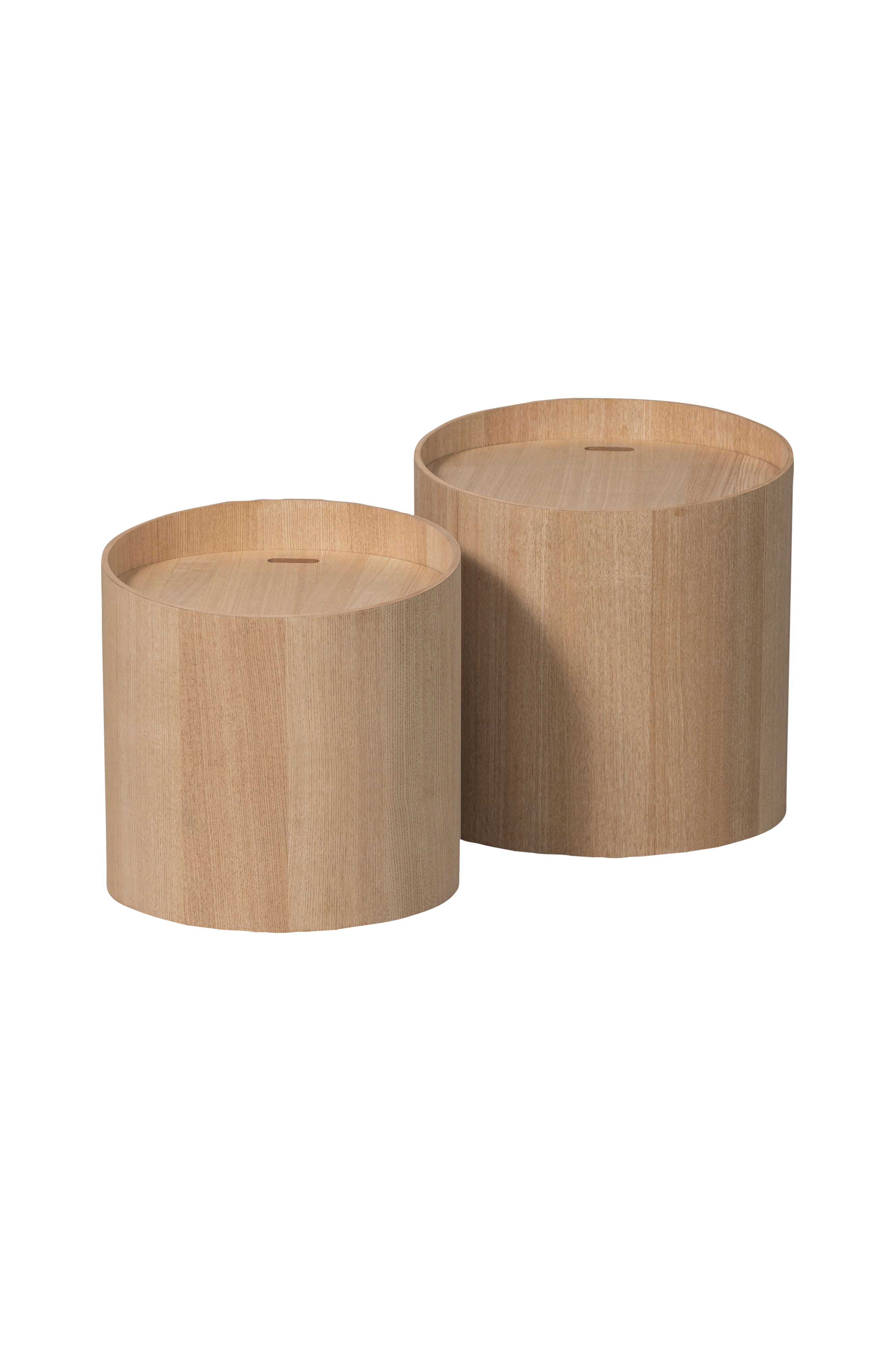 Ajaton ja pelkistetty: kuvaa näitä kahta Vesper-sivupöytää. Säilytystilan sisältävät pyöreät pöydät kuuluvat hollantilaisen WOOOD-sisustusmerkin mallistoon. Valmistettu MDF-levystä, jossa vaalea tammenvärinen viimeistely. Luonnonvärinen viimeistely luo rauhoittavan tunnelman, joten pöydät sopivat hyvin japanilaiseen tai pohjoismaiseen sisustukseen.