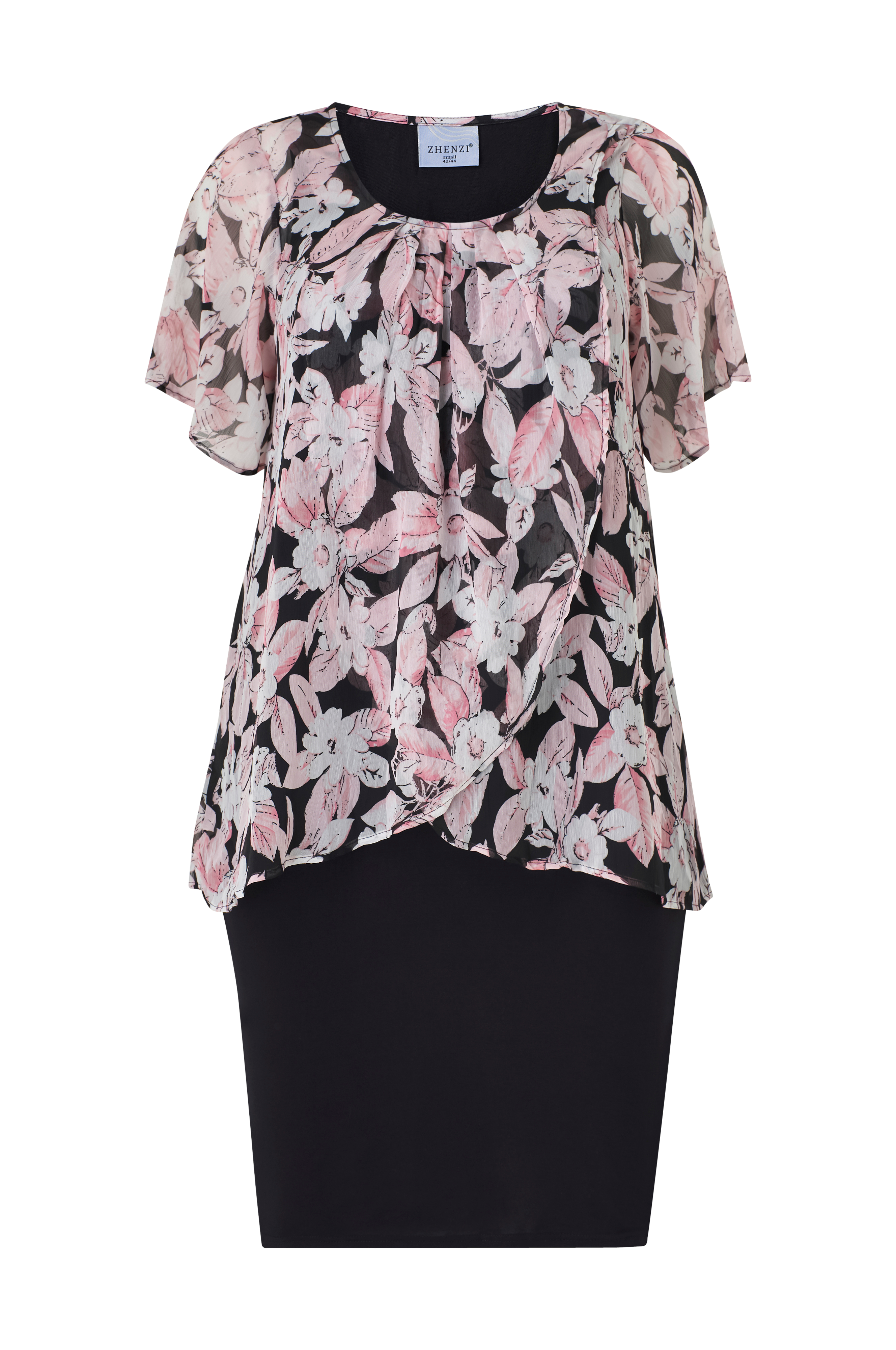 • Plus-koot• Malli sifonkikrepistä kietaisumallilla ylhäällä• Pyöreä pääntie taitetuilla vekeillä edessä• Lyhyt hiha• Pitkä alushame trikoosta• Pituus: 107 cm koossa S