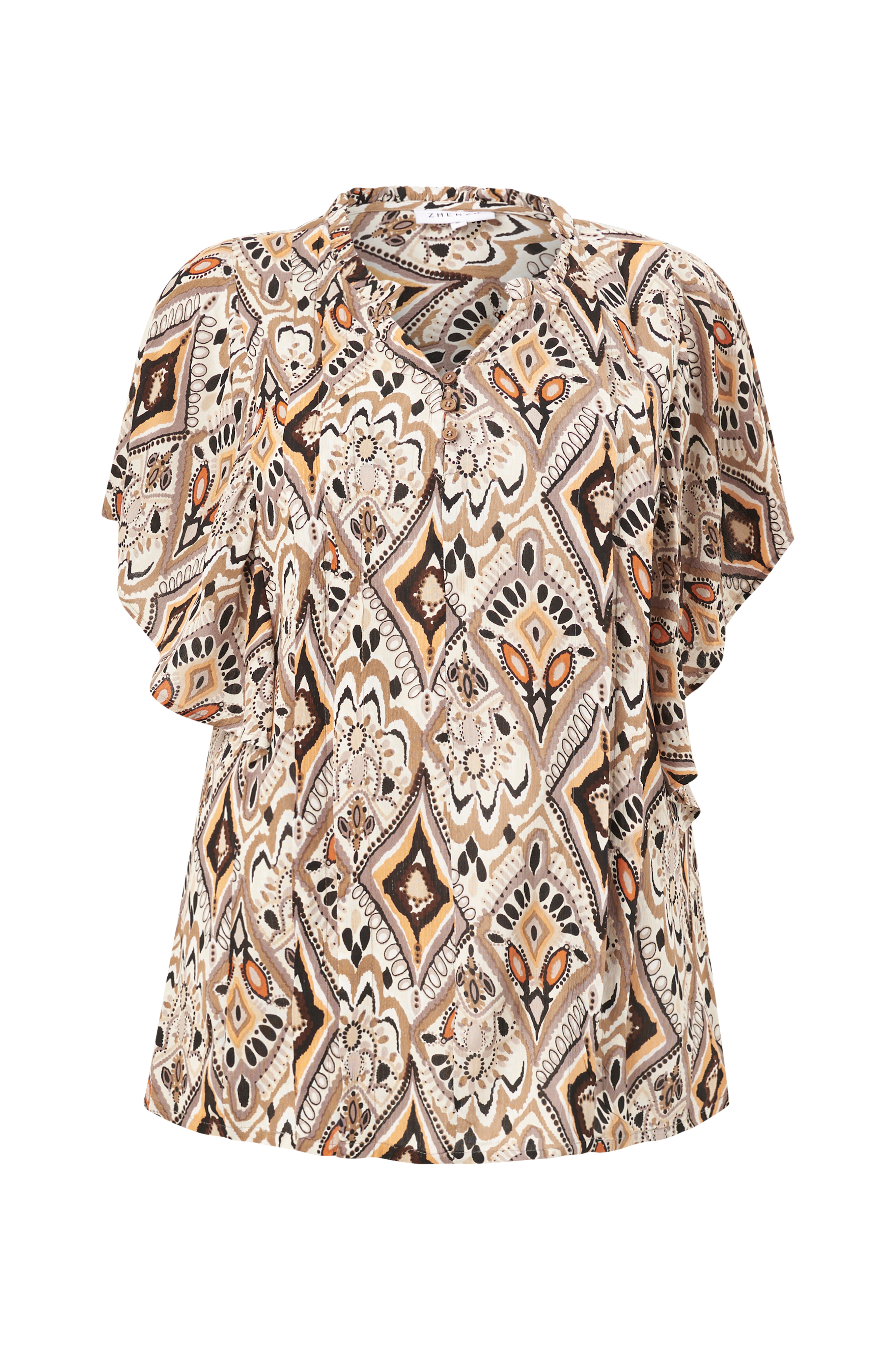 • V-kaula-aukko napeilla• Röyhelöreuna kaulassa• Leveät röyhelöhihat• Löysä istuvuus• Vekit edessä• Plus-koot