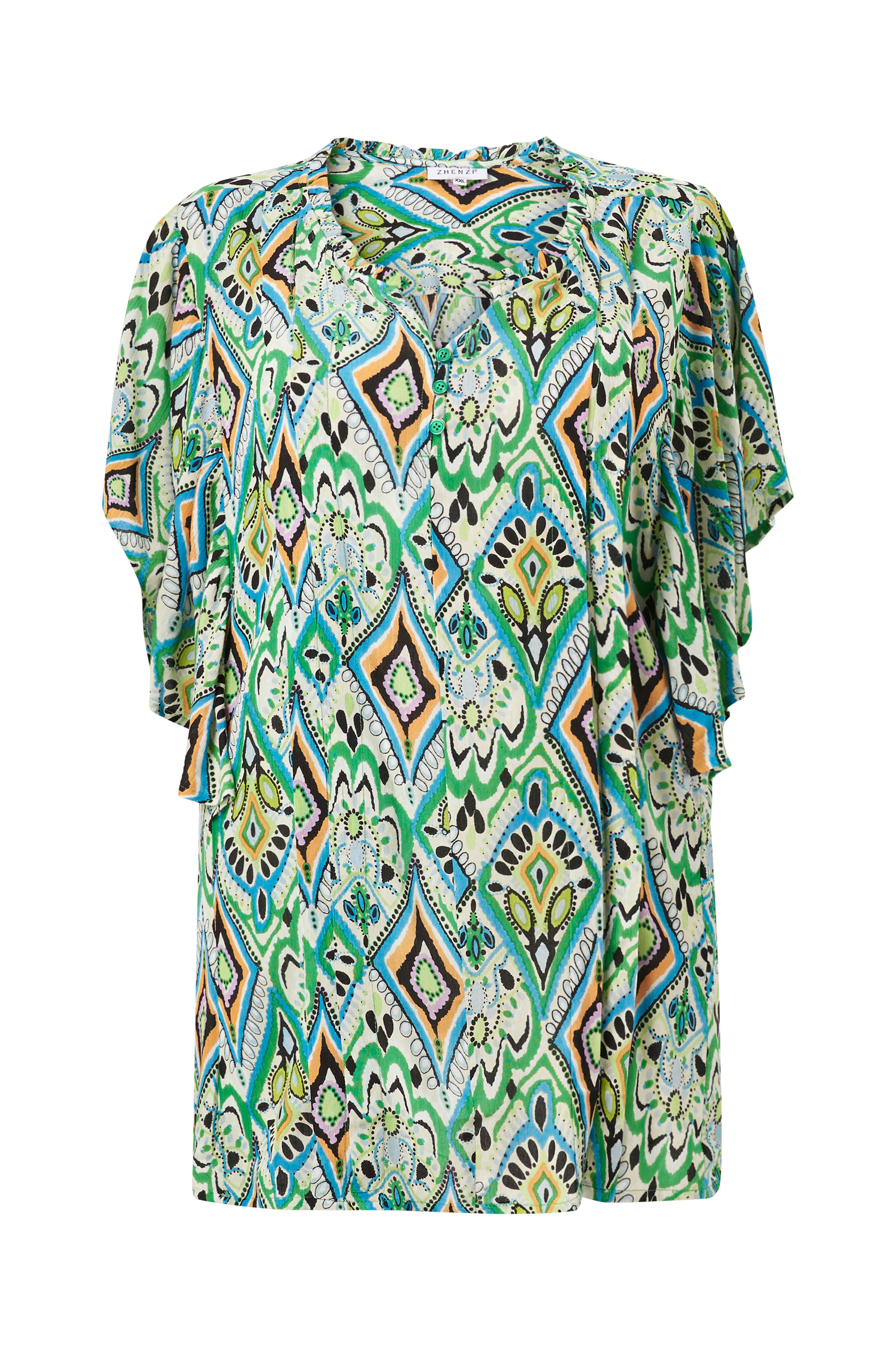• V-kaula-aukko napeilla• Röyhelöreuna kaulassa• Leveät röyhelöhihat• Löysä istuvuus• Vekit edessä• Plus-koot