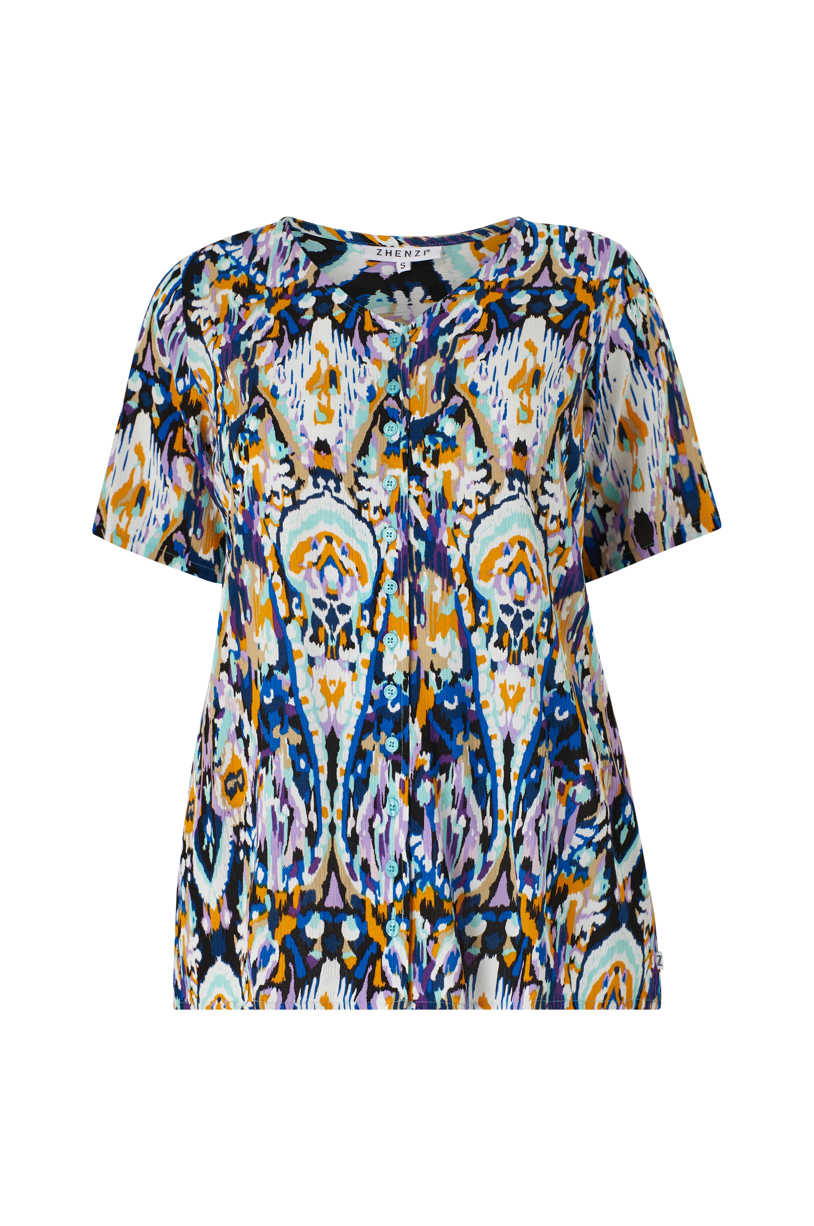 • Kuvioitu pusero rypytetystä viskoosista• V-kaula-aukko• Napit edessä• Lyhyet hihat• Plus-koot