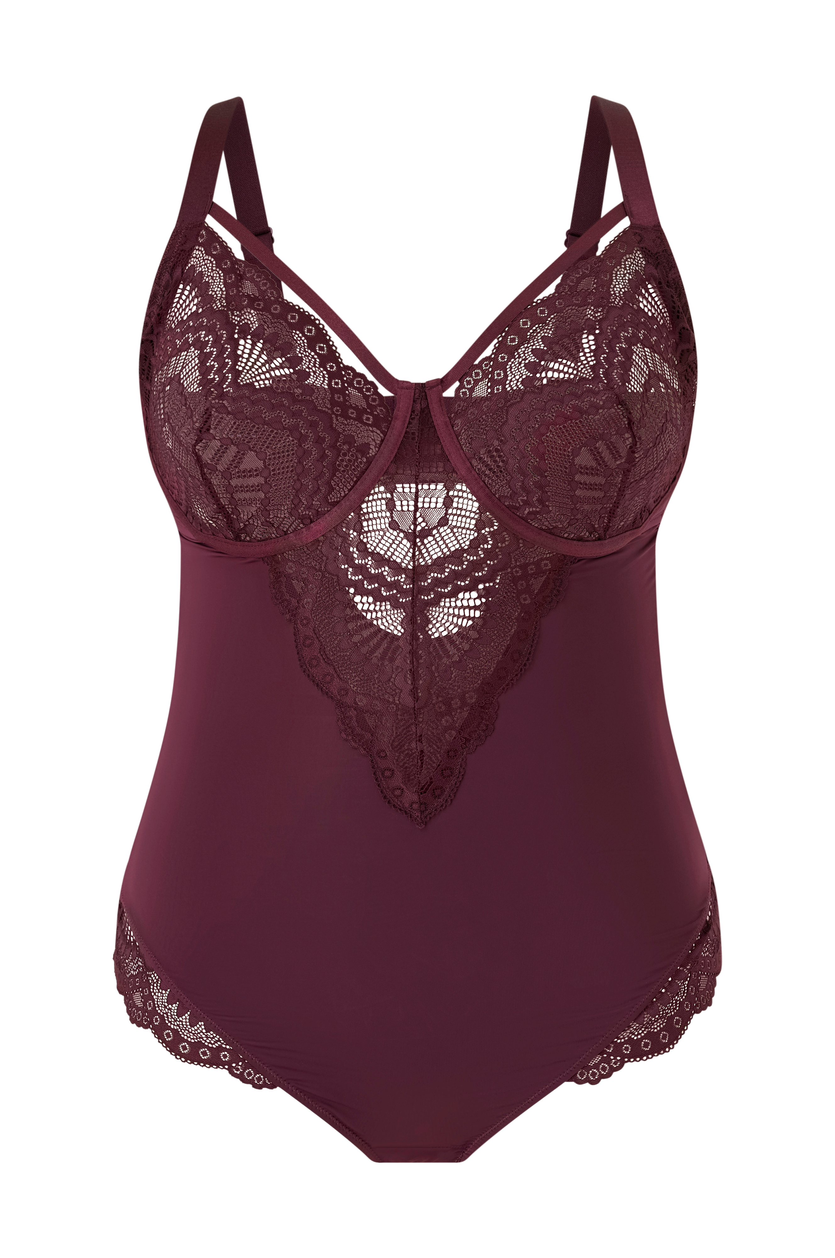 • Body-asu verkkokankaasta kaarituella ja pitsiyksityiskohdilla• Säädettävät olkaimet• Nepparit jalkovälissä• Hakaskiinnitys• Plus-koot