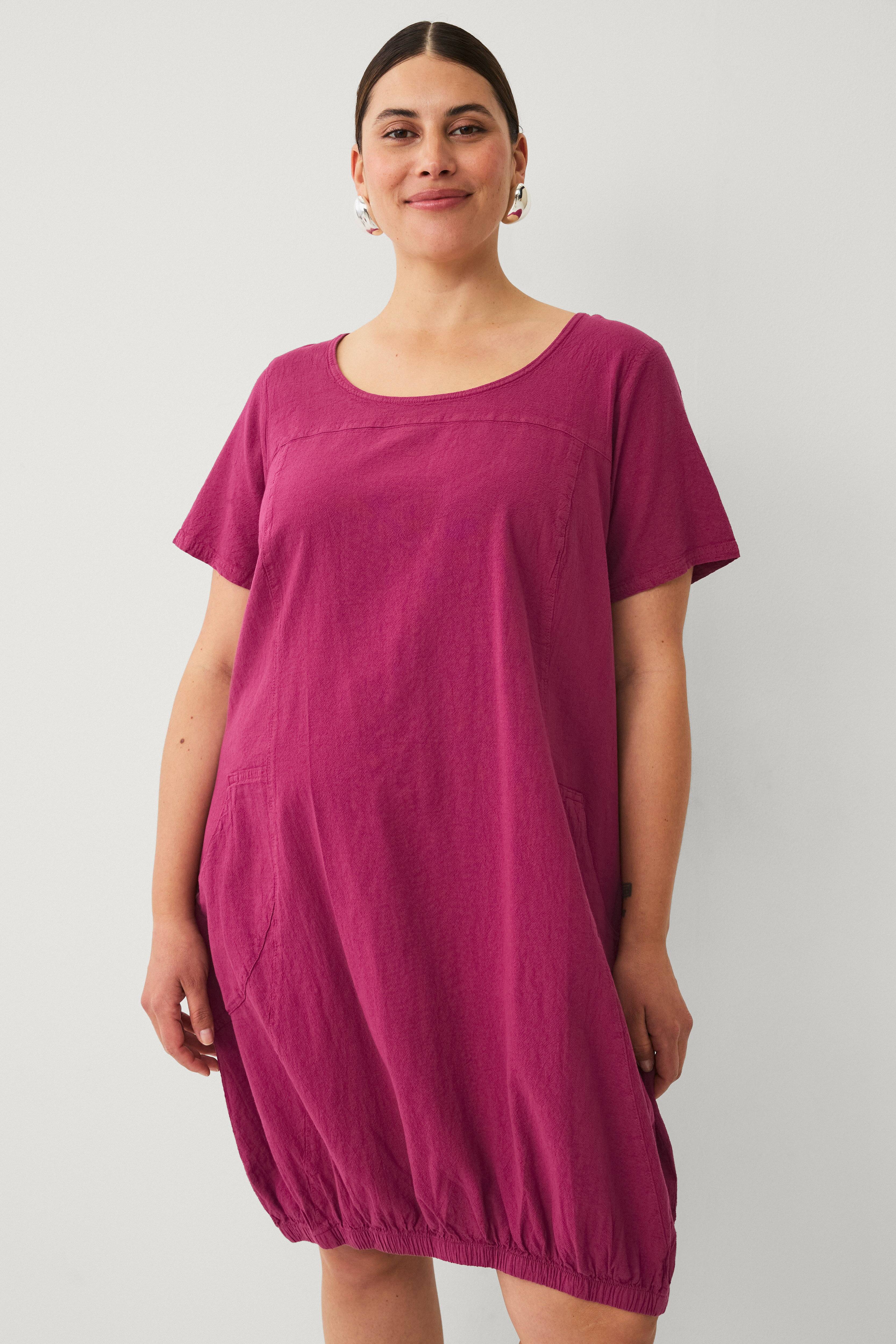 Kaunis mekko eläväpintaista puuvillaa. Kuminauha helmassa luo pehmeän, pyöristetyn siluetin. Pyöreä pääntie, lyhyet hihat ja sivutaskut. Pituus n. 96 cm koossa S.