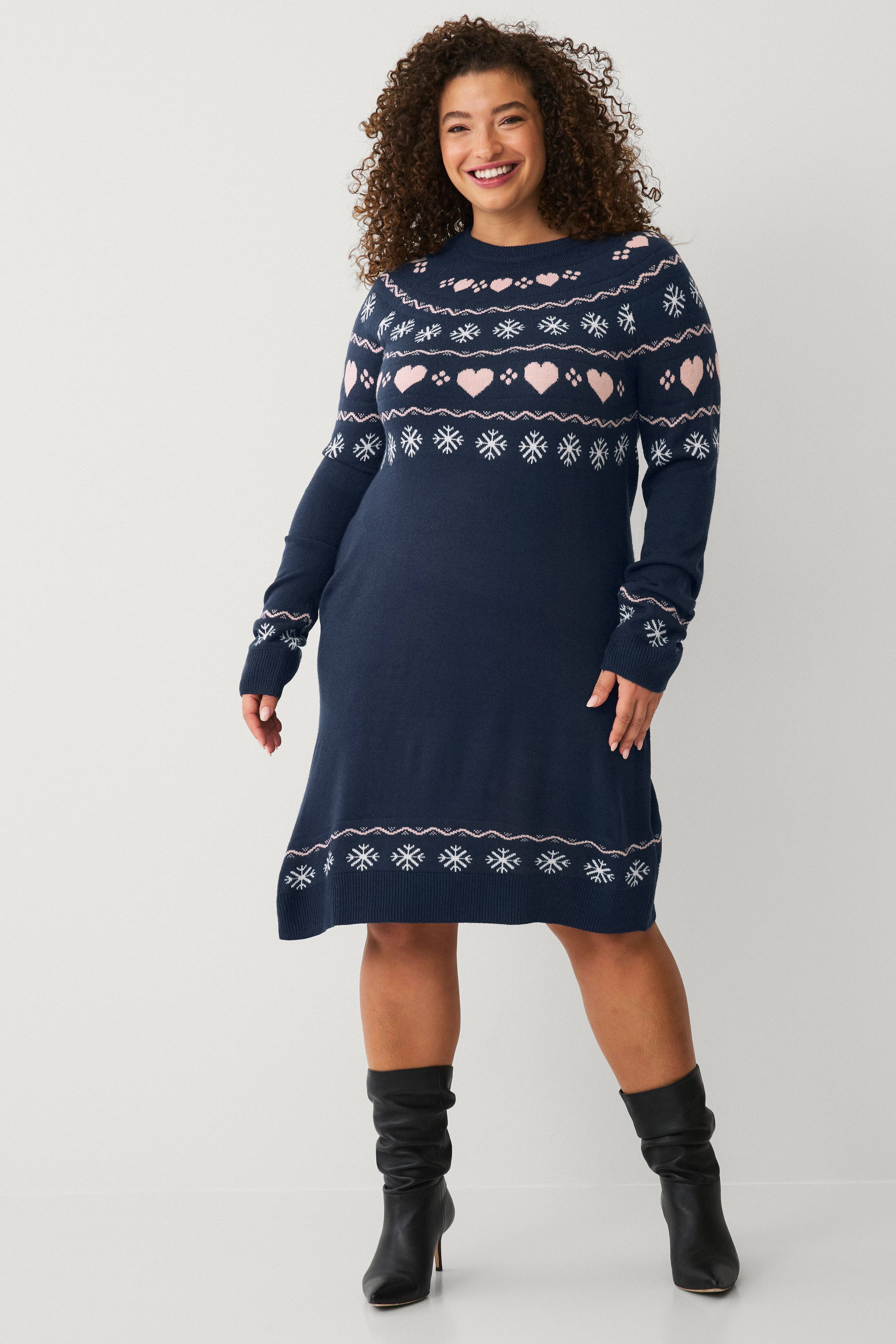 • Neulottu mekko joulukuviolla• Löysä istuvuus• Veneen muotoinen kaula-aukko• Pitkät hihat• Ribatut reunat manseteilla ja alhaalla• Plus-koot• Pituus: 110 cm koossa S