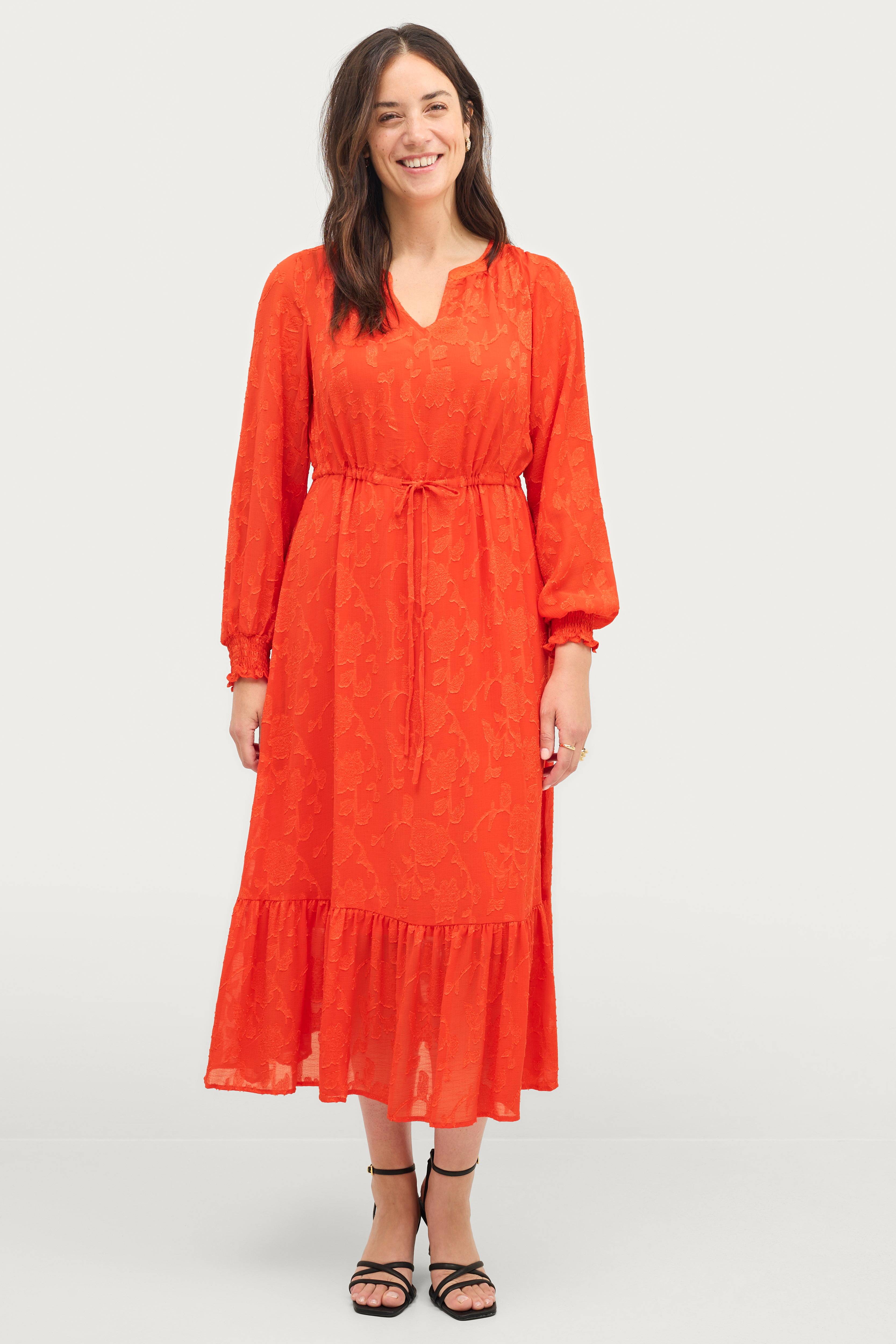 • Plus-koot • Kuviokudottu malli kiristysnyörillä vyötäröllä • Pyöreä pääntie halkiolla edessä • Pitkä, leveä hiha joustavilla saumoilla alhaalla • Leveä röyhelö alahelmassa • Poistettava alushame trikoosta v-kaula-aukolla ja säädettävillä, ohuilla olkaimilla • Pituus: 129 cm koossa S