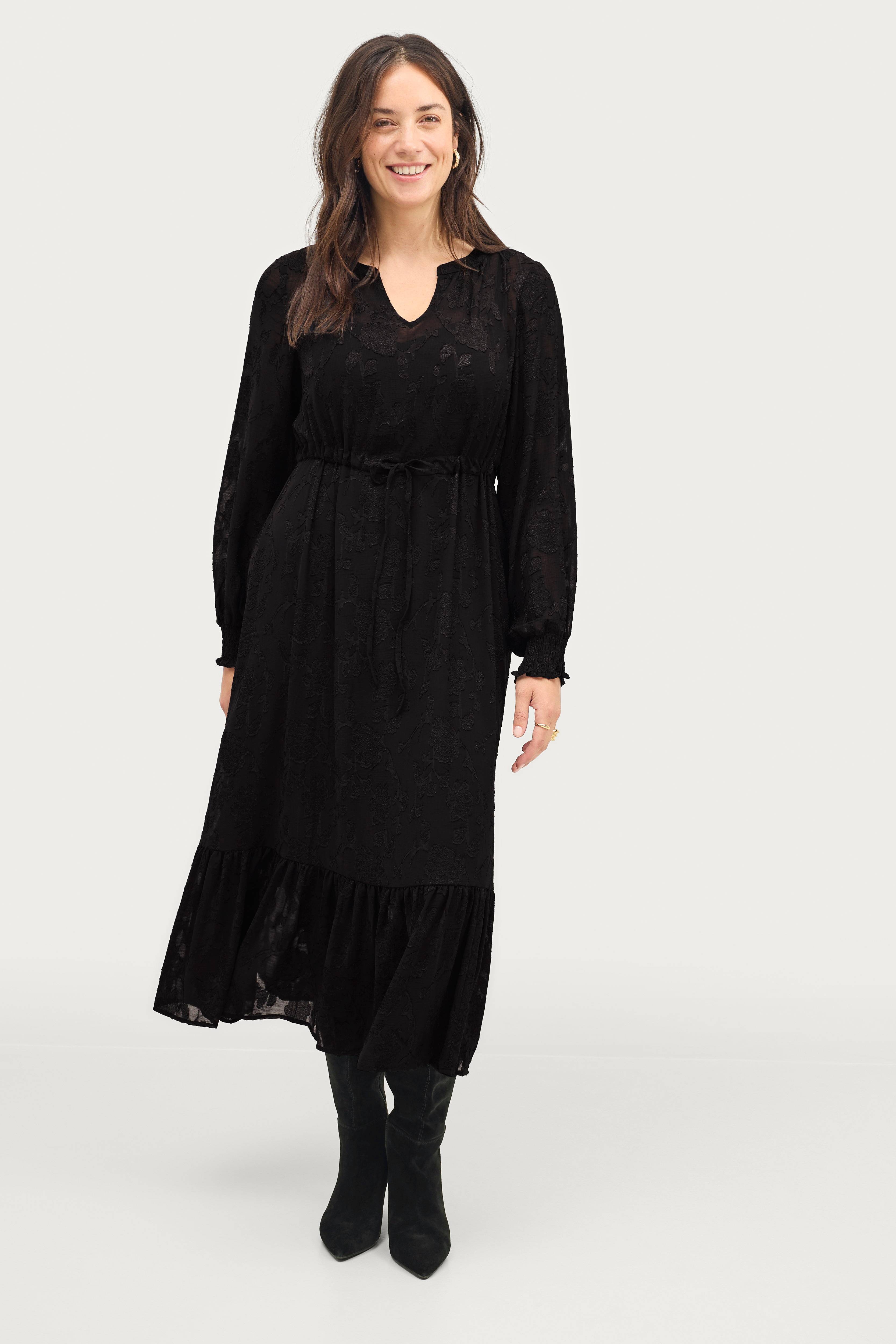 • Plus-koot • Kuviokudottu malli kiristysnyörillä vyötäröllä • Pyöreä pääntie halkiolla edessä • Pitkä, leveä hiha joustavilla saumoilla alhaalla • Leveä röyhelö alahelmassa • Poistettava alushame trikoosta v-kaula-aukolla ja säädettävillä, ohuilla olkaimilla • Pituus: 129 cm koossa S