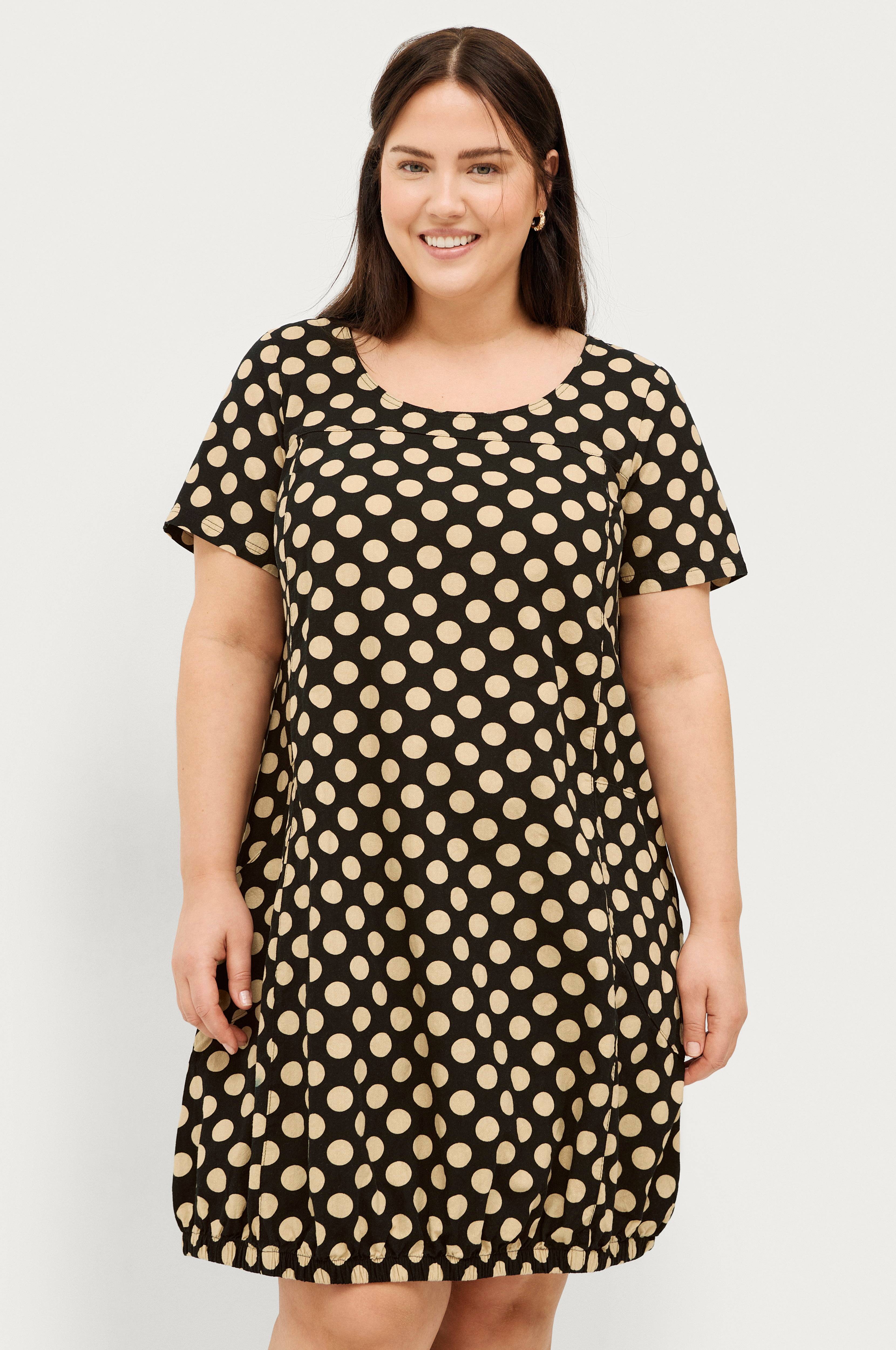 Lyhythihainen mekko kuviollista puuvillaa. Taskut edessä ja joustava alareuna. Pituus n. 95 cm koossa S.