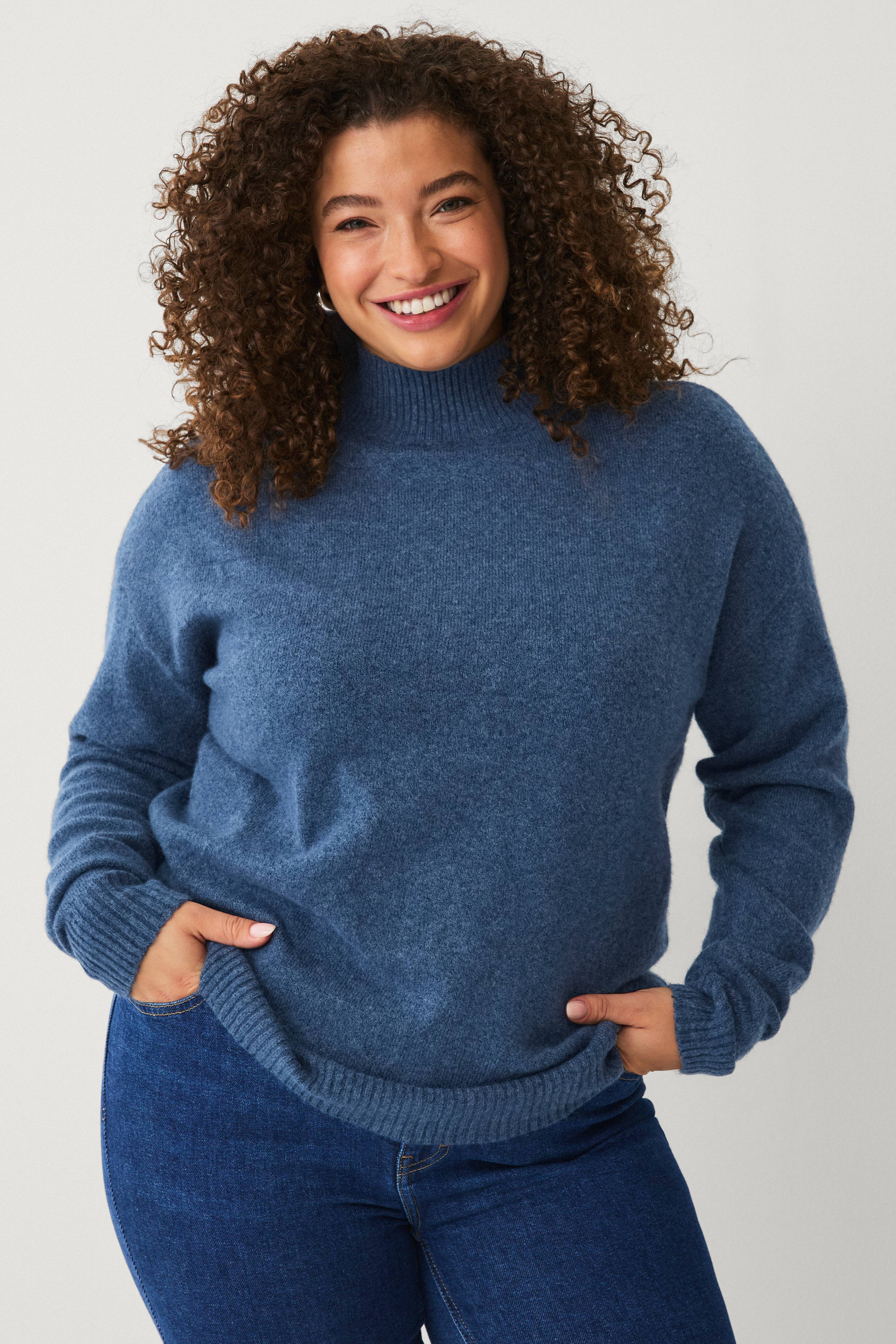 • Plus-koot• Suora, sileästi kudottu malli• Korkea, resorimainen kaulus• Pudotettu olkapää pitkällä hihalla• Ribbineulos alhaalla ja hihansuissa