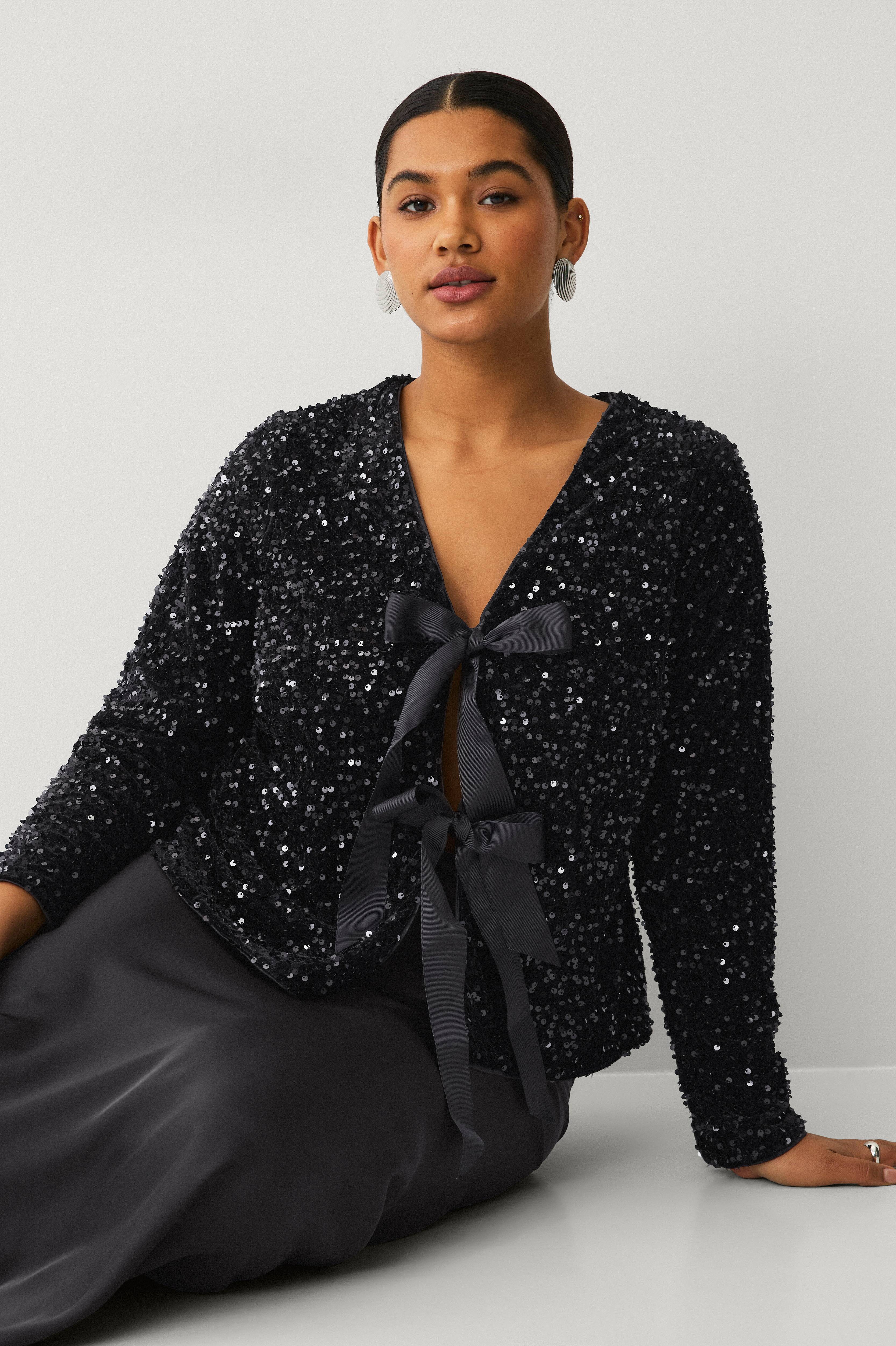 • Toppi kimaltelevilla paljeteilla• Avoin etuosa kahdella koristeellisella nyörillä• Pitkä hiha• Plus-koot