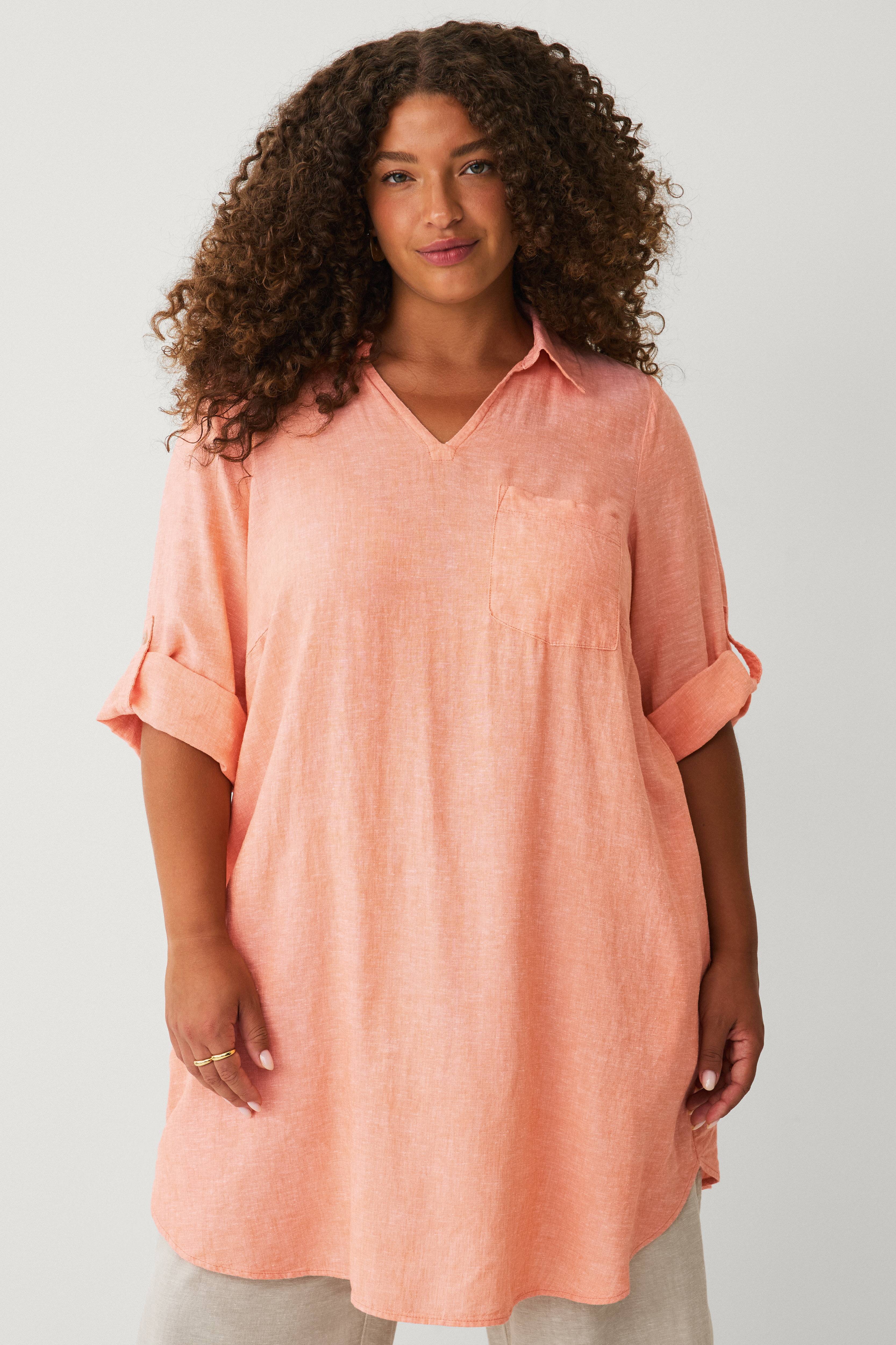 • Pellavatunika puolipitkillä, ylös käännetyillä hihoilla napilla