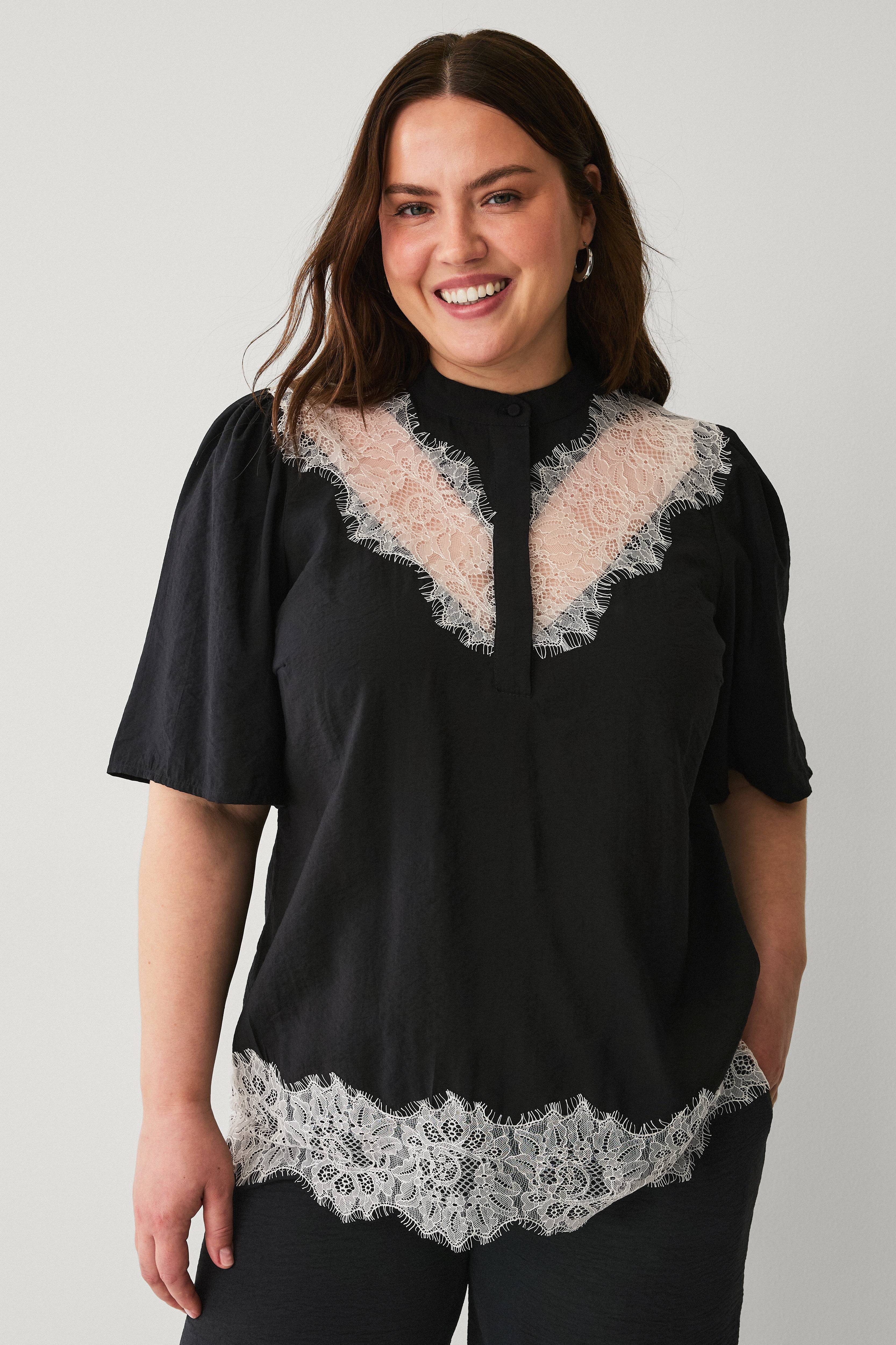 • Lyhythihainen pusero korkealla kauluksella• Rypytys olkapäissä• Lyhyt napituslista ylhäällä edessä• Pitsiyksityiskohta edessä ja helmassa• Plus-koot